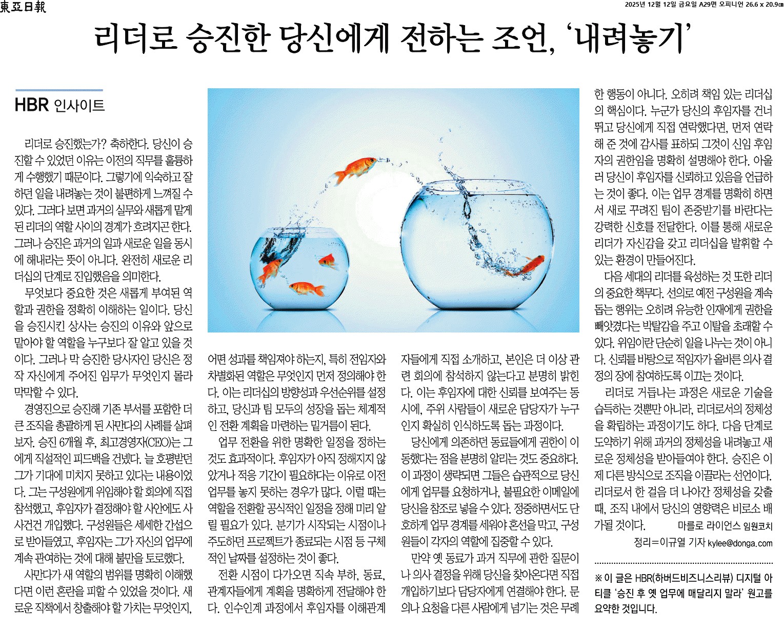④ 다음 세대의 리더를 육성하는 것 또한 리더의 중요한 책무다. 선의로 예전 구성원을 계속 돕는 행위는 오히려 유능한 인재에게 권한을 빼앗겼다는 박탈감을 주고 이탈을 초래할 수 있다. 위임이란 단순히 일을 나누는 것이 아니다. 신뢰를 바탕으로 적임자가 올바른 의사 결정의 장에 참여하도록 이끄는 것이다.