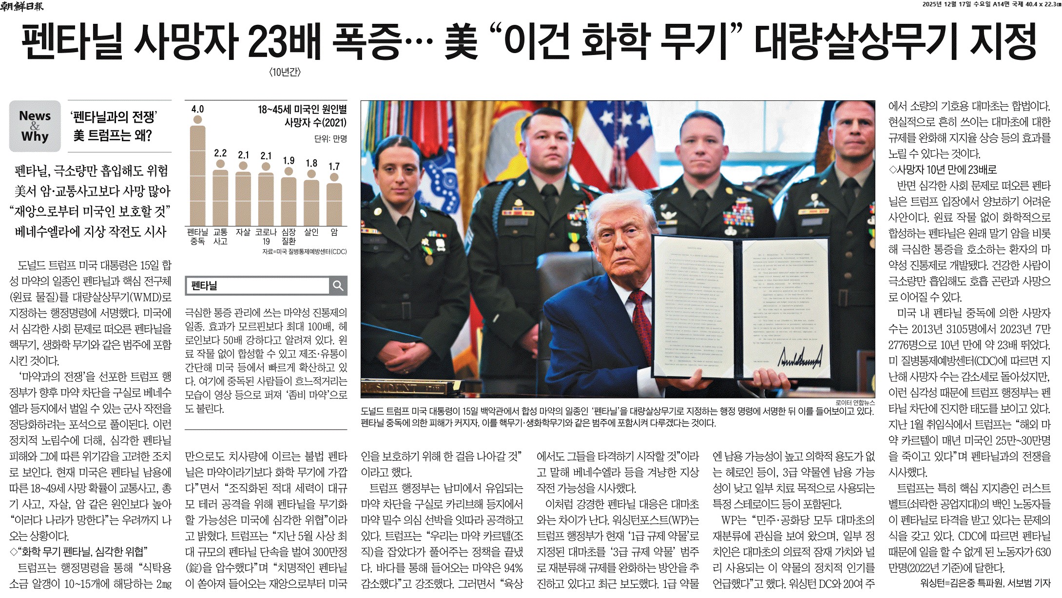 ① 도널드 트럼프 미국 대통령은 15일 합성 마약의 일종인 펜타닐과 핵심 전구체(원료 물질)를 대량살상무기(WMD)로 지정하는 행정명령에 서명했다. 미국에서 심각한 사회 문제로 떠오른 펜타닐을 핵무기, 생화학 무기와 같은 범주에 포함시킨 것이다. ‘마약과의 전쟁’을 선포한 트럼프 행정부가 향후 마약 차단을 구실로 베네수엘라 등지에서 벌일 수 있는 군사 작전을 정당화하려는 포석으로 풀이된다. 이런 정치적 노림수에 더해, 심각한 펜타닐 피해와 그에 따른 위기감을 고려한 조치로 보인다. 현재 미국은 펜타닐 남용에 따른 18~49세 사망 확률이 교통사고, 총기 사고, 자살, 암 같은 원인보다 높아 “이러다 나라가 망한다”는 우려까지 나오는 상황이다.