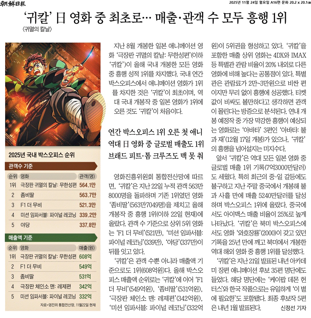 ① 지난 8월 개봉한 일본 애니메이션 영화 ‘극장판 귀멸의 칼날: 무한성편’(이하 ‘귀칼’)이 올해 국내 개봉한 모든 영화 중 흥행 성적 1위를 차지했다. 국내 연간 박스오피스에서 애니메이션 영화가 1위를 차지한 것은 ‘귀칼’이 최초이며, 역대 국내 개봉작 중 일본 영화가 1위에 오른 것도 ‘귀칼’이 처음이다.