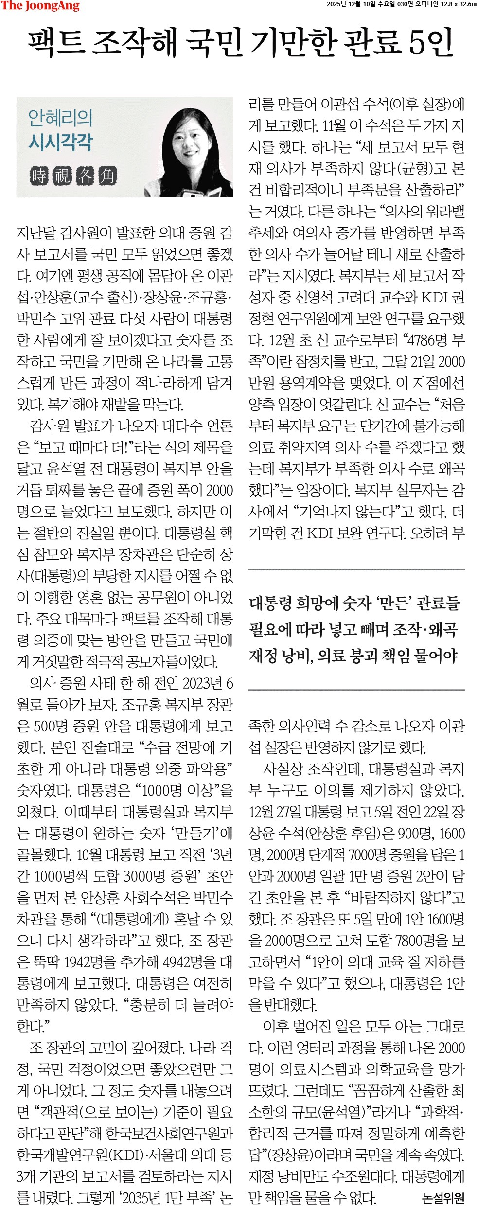 ② 대다수 언론은 감사원 발표와 관련, "보고 때마다 더!"라는 식의 제목을 달고 윤석열 전 대통령이 복지부 안을 거듭 퇴짜놓은 끝에 정원이 2000명으로 늘었다고 보도했다. 하지만 보고서를 보면, 절반의 진실이다. 대통령실 핵심 참모와 복지부 장·차관은 단순히 상사(대통령)의 부당한 지시를 어쩔 수 없이 이행한 영혼 없는 공무원이 아니었다. 주요 대목마다 대담한 팩트 조작과 대국민 거짓말을 일삼은 적극적 공모자들이었다.