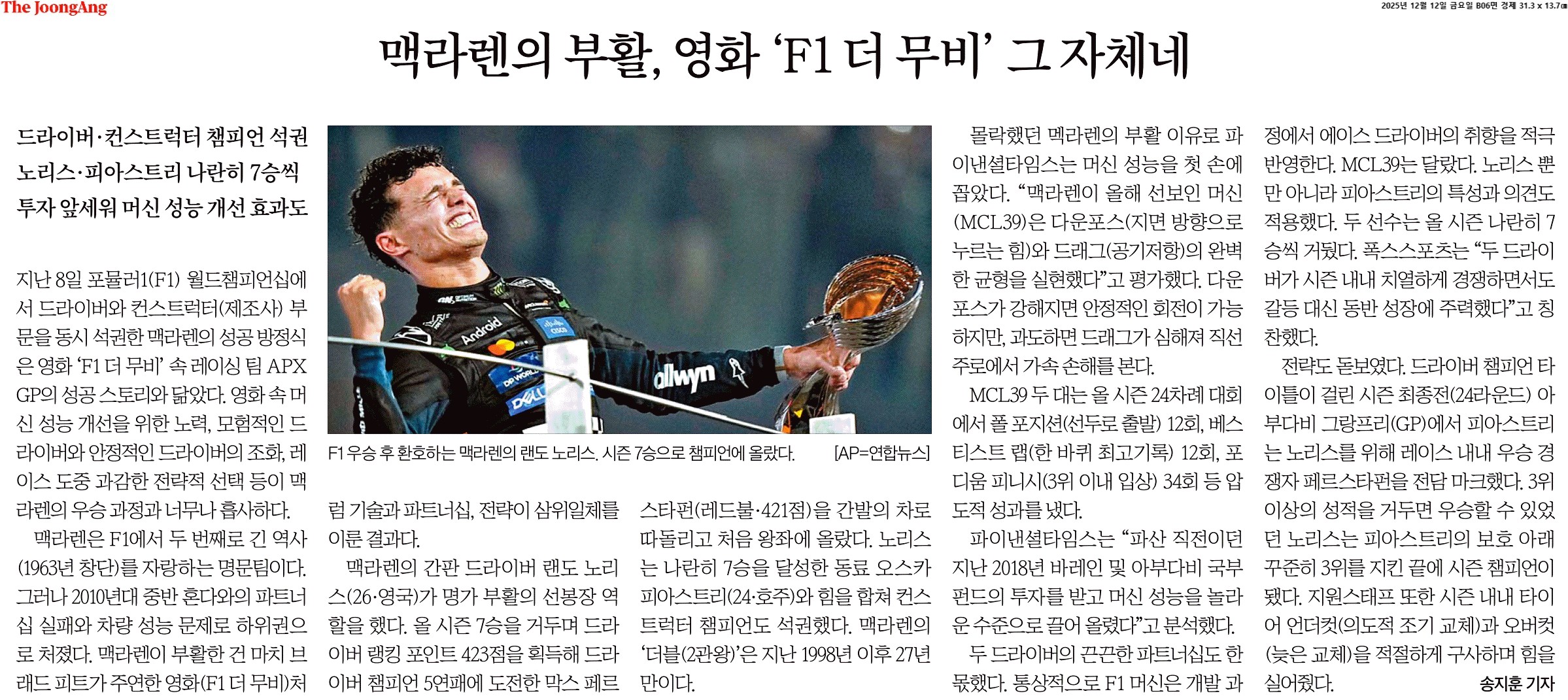 ① 지난 8일 포뮬러1(F1) 월드챔피언십에서 드라이버와 컨스트럭터(제조사) 부문을 동시 석권한 맥라렌의 성공 방정식은 영화 ‘F1 더 무비’ 속 레이싱 팀 APX GP의 성공 스토리와 닮았다. 영화 속 머신 성능 개선을 위한 노력, 모험적인 드라이버와 안정적인 드라이버의 조화, 레이스 도중 과감한 전략적 선택 등이 맥라렌의 우승 과정과 너무나 흡사하다.
