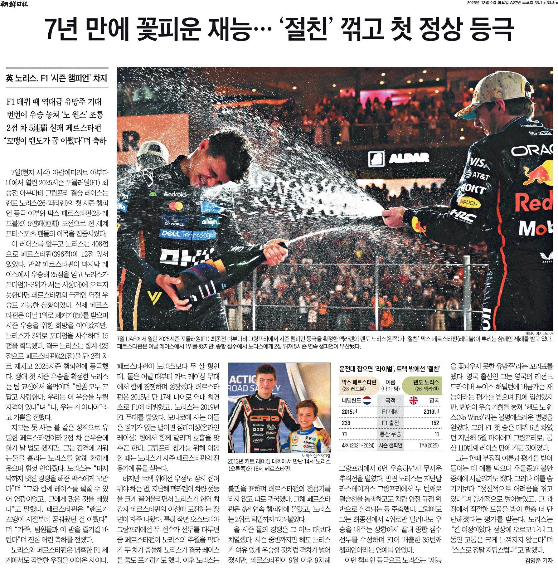 ① 7일(현지 시각) 아랍에미리트 아부다비에서 열린 2025시즌 포뮬러원(F1) 최종전 아부다비 그랑프리 결승 레이스는 랜도 노리스(26·맥라렌)의 첫 시즌 챔피언 등극 여부와 막스 페르스타펀(28·레드불)의 5연패(連覇) 도전으로 전 세계 모터스포츠 팬들의 이목을 집중시켰다.