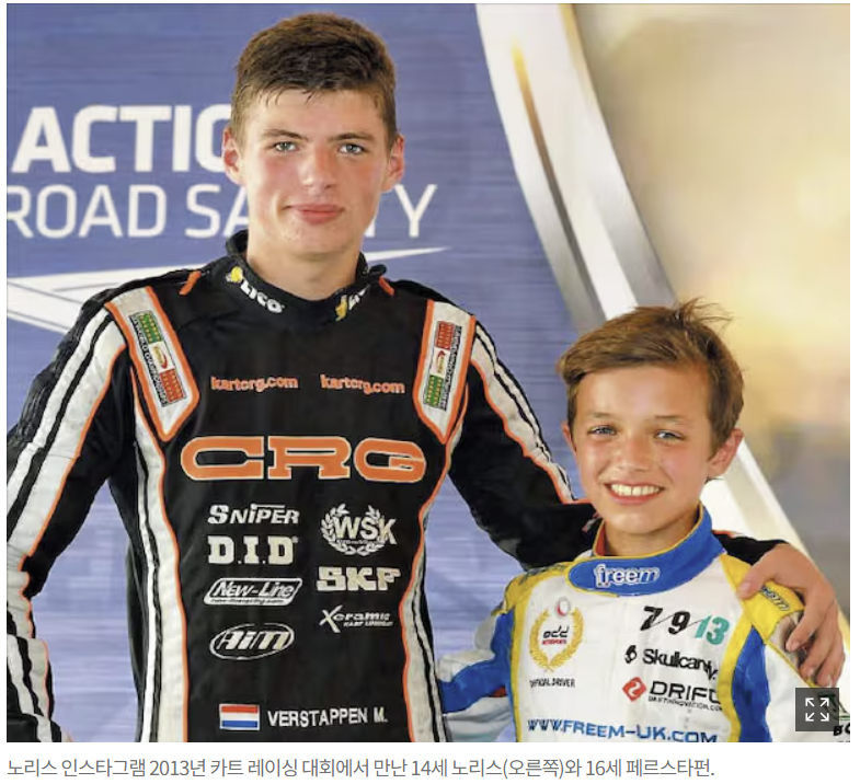 ④ 노리스와 페르스타펀은 냉혹한 F1 세계에서도 각별한 우정을 이어온 사이다. 페르스타펀이 노리스보다 두 살 형인데, 둘은 어릴 때부터 카트 레이싱 무대에서 함께 경쟁하며 성장했다. 페르스타펀은 2015년 만 17세 나이로 역대 최연소로 F1에 데뷔했고, 노리스는 2019년 F1 무대를 밟았다. 모나코에 사는 이들은 경기가 없는 날이면 심레이싱(온라인 레이싱) 팀에서 함께 달리며 호흡을 맞추곤 한다. 그랑프리 참가를 위해 이동할 때는 노리스가 자주 페르스타펀의 전용기에 몸을 싣는다.
