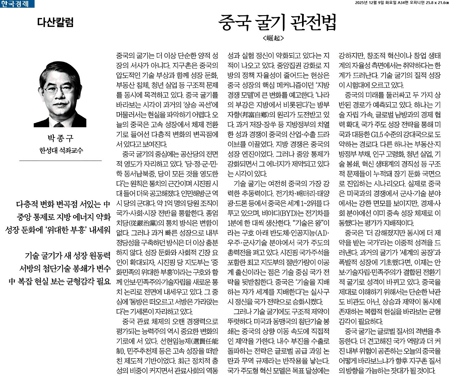 ① 중국의 굴기는 더 이상 단순한 양적 성장의 서사가 아니다. 지구촌은 중국의 압도적인 기술 부상과 함께 성장 둔화, 부동산 침체, 청년 실업 등 구조적 문제를 동시에 목격하고 있다. 중국 굴기를 바라보는 시각이 과거의 ‘상승 곡선’에 머물러서는 현실을 파악하기 어렵다. 오늘의 중국은 고속 성장에서 체제 전환기로 들어선 다층적 변화의 변곡점에 서 있다고 보여진다.