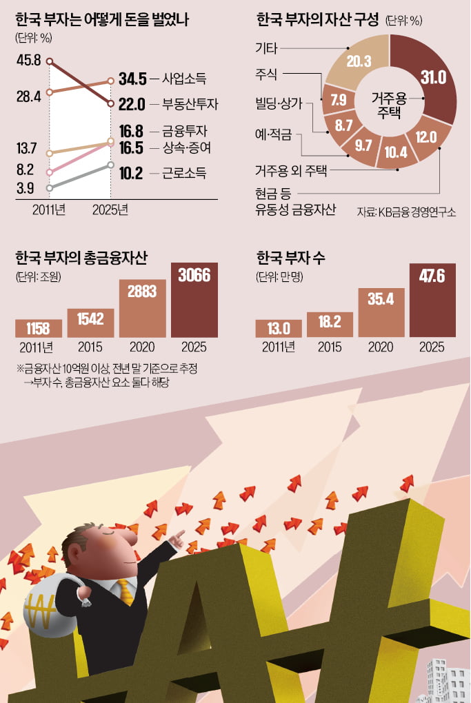 ② 한국 부자가 보유한 총금융자산은 3066조원이었다. 전년 대비 8.5% 증가했다. 국내외 증시가 활황세를 보인 영향으로 풀이된다. 특히 부자의 금융자산 증가율(8.5%)은 전체 가계 금융자산 증가율(4.4%)의 두 배 가까이 돼 일반 가계 대비 부자의 자산 축적 속도가 더 빨랐다.