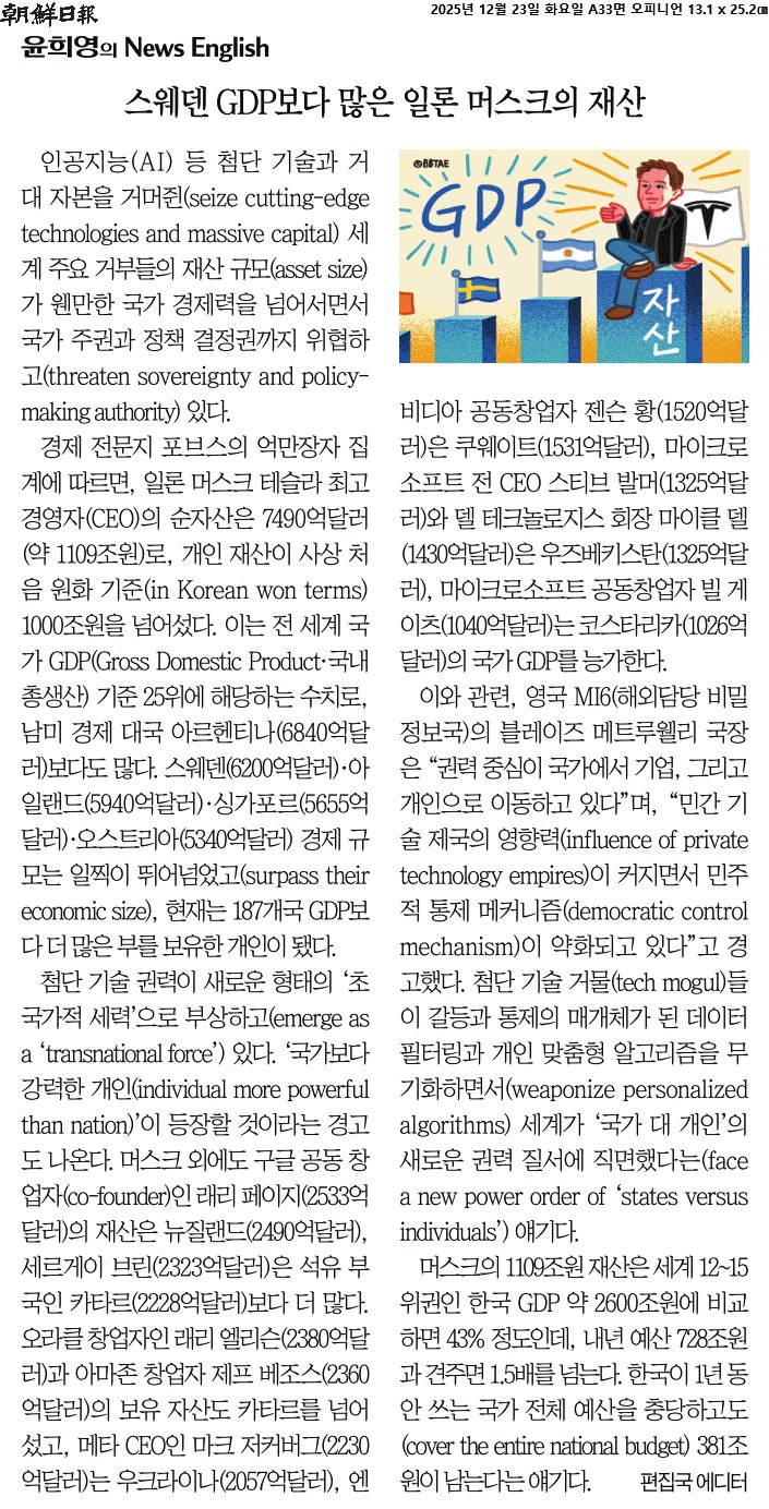 ① 인공지능(AI) 등 첨단 기술과 거대 자본을 거머쥔(seize cutting-edge technologies and massive capital) 세계 주요 거부들의 재산 규모(asset size)가 웬만한 국가 경제력을 넘어서면서 국가 주권과 정책 결정권까지 위협하고(threaten sovereignty and policy-making authority) 있다.