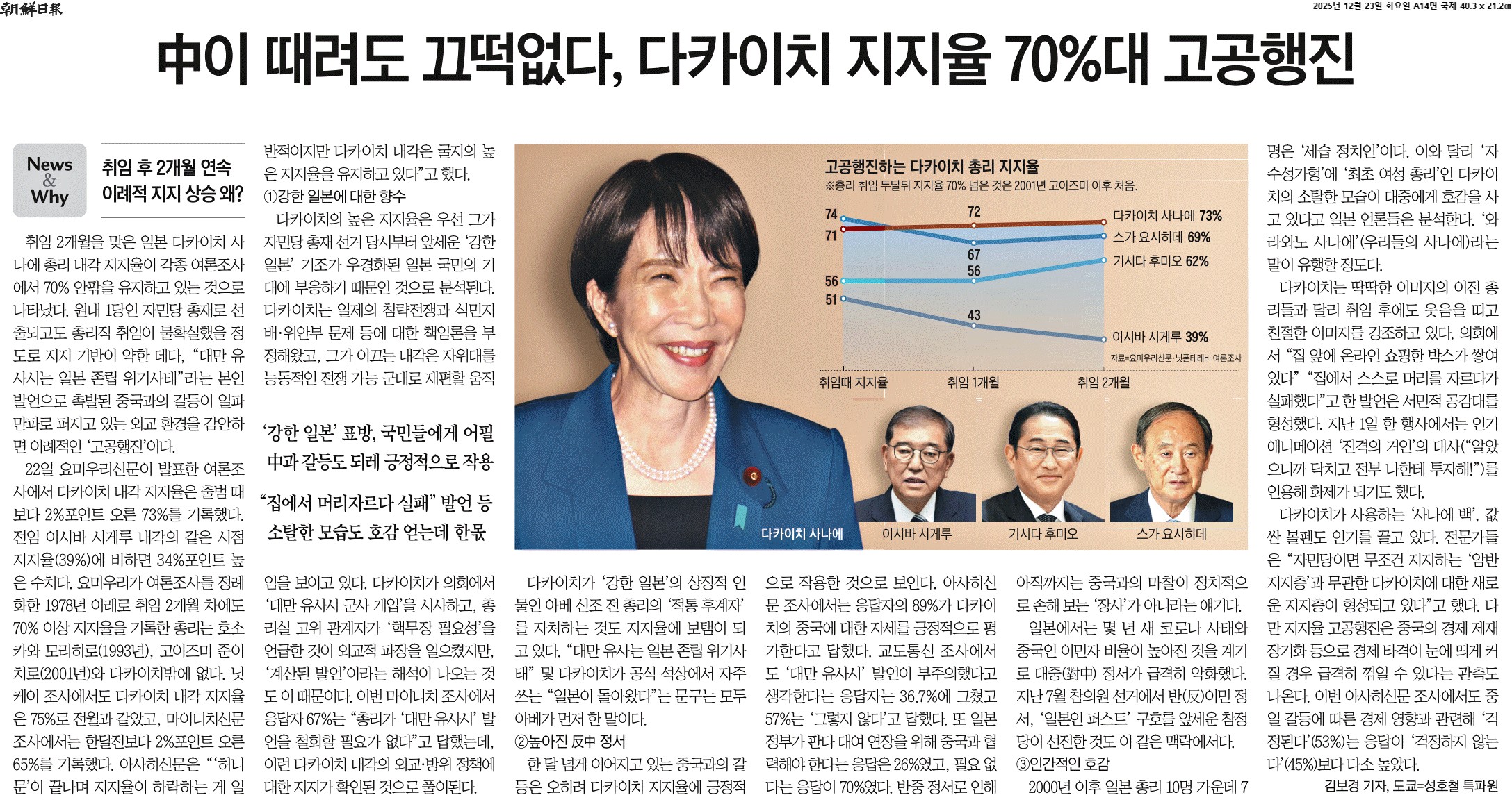 ① 취임 2개월을 맞은 일본 다카이치 사나에 총리 내각 지지율이 각종 여론조사에서 70% 안팎을 유지하고 있는 것으로 나타났다. 원내 1당인 자민당 총재로 선출되고도 총리직 취임이 불확실했을 정도로 지지 기반이 약한 데다, “대만 유사시는 일본 존립 위기사태”라는 본인 발언으로 촉발된 중국과의 갈등이 일파만파로 퍼지고 있는 외교 환경을 감안하면 이례적인 ‘고공행진’이다.