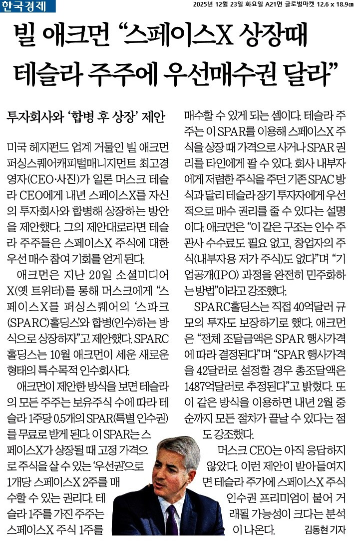 ② 애크먼이 제안한 방식을 보면 테슬라의 모든 주주는 보유주식 수에 따라 테슬라 1주당 0.5개의 SPAR(특별 인수권)를 무료로 받게 된다. 이 SPAR는 스페이스X가 상장될 때 고정 가격으로 주식을 살 수 있는 ‘우선권’으로 1개당 스페이스X 2주를 매수할 수 있는 권리다. 테슬라 1주를 가진 주주는 스페이스X 주식 1주를 매수할 수 있게 되는 셈이다.