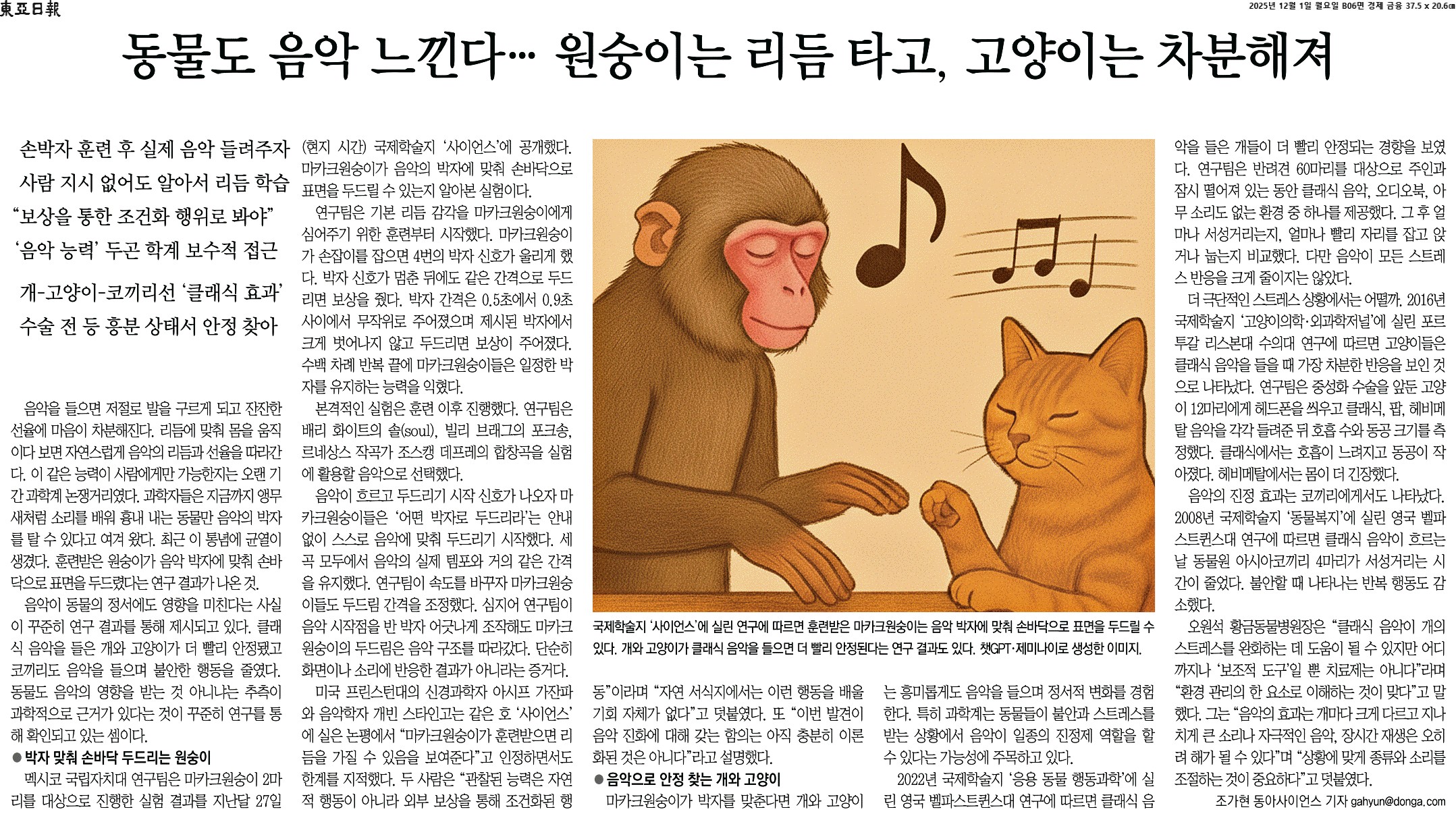 ③ 마카크원숭이가 박자를 맞춘다면 개와 고양이는 흥미롭게도 음악을 들으며 정서적 변화를 경험한다. 특히 과학계는 동물들이 불안과 스트레스를 받는 상황에서 음악이 일종의 진정제 역할을 할 수 있다는 가능성에 주목하고 있다.
