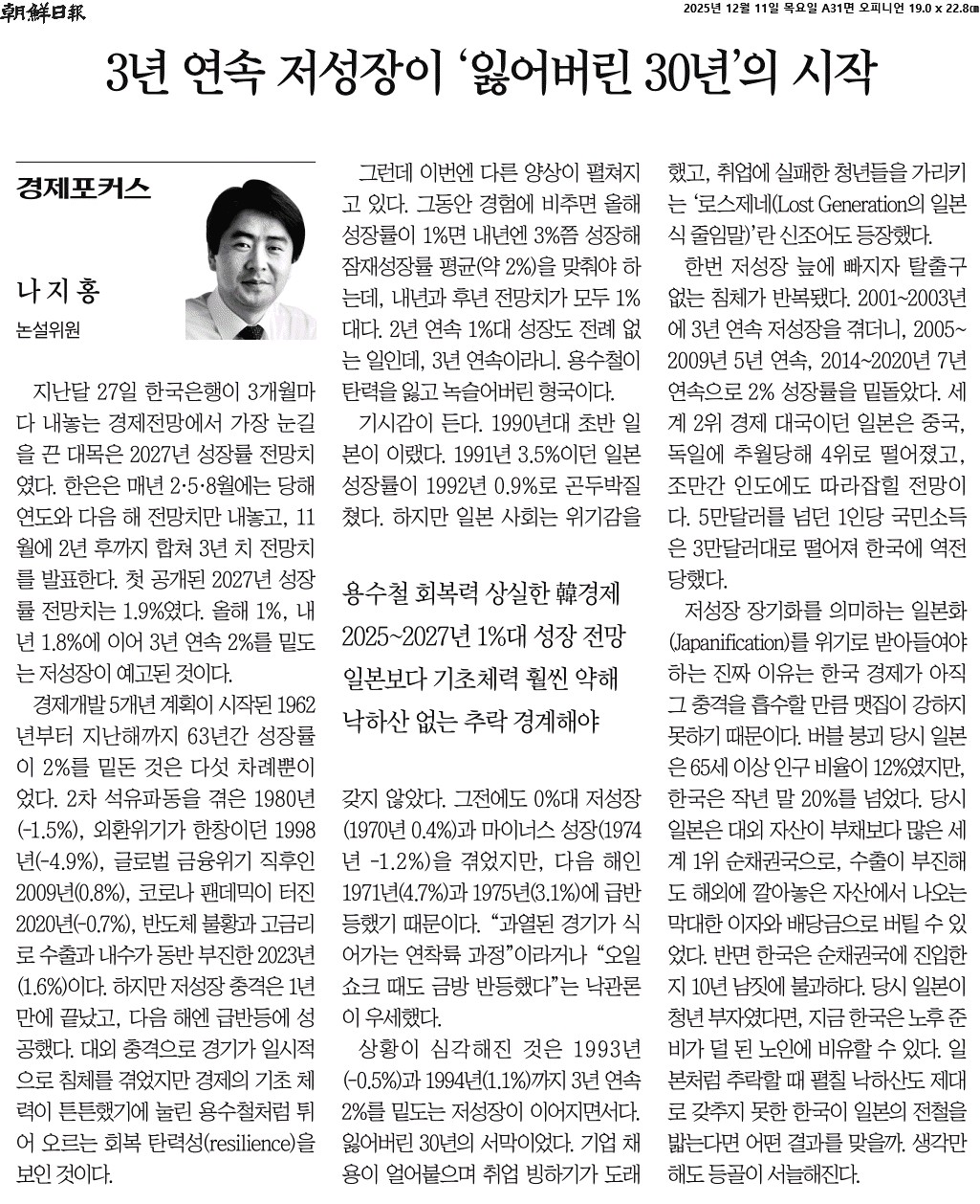 ② 대외 충격으로 경기가 일시적으로 침체를 겪었지만 경제의 기초 체력이 튼튼했기에 눌린 용수철처럼 튀어 오르는 회복 탄력성(resilience)을 보인 것이다. 그런데 이번엔 다른 양상이 펼쳐지고 있다. 그동안 경험에 비추면 올해 성장률이 1%면 내년엔 3%쯤 성장해 잠재성장률 평균(약 2%)을 맞춰야 하는데, 내년과 후년 전망치가 모두 1%대다. 2년 연속 1%대 성장도 전례 없는 일인데, 3년 연속이라니. 용수철이 탄력을 잃고 녹슬어버린 형국이다.