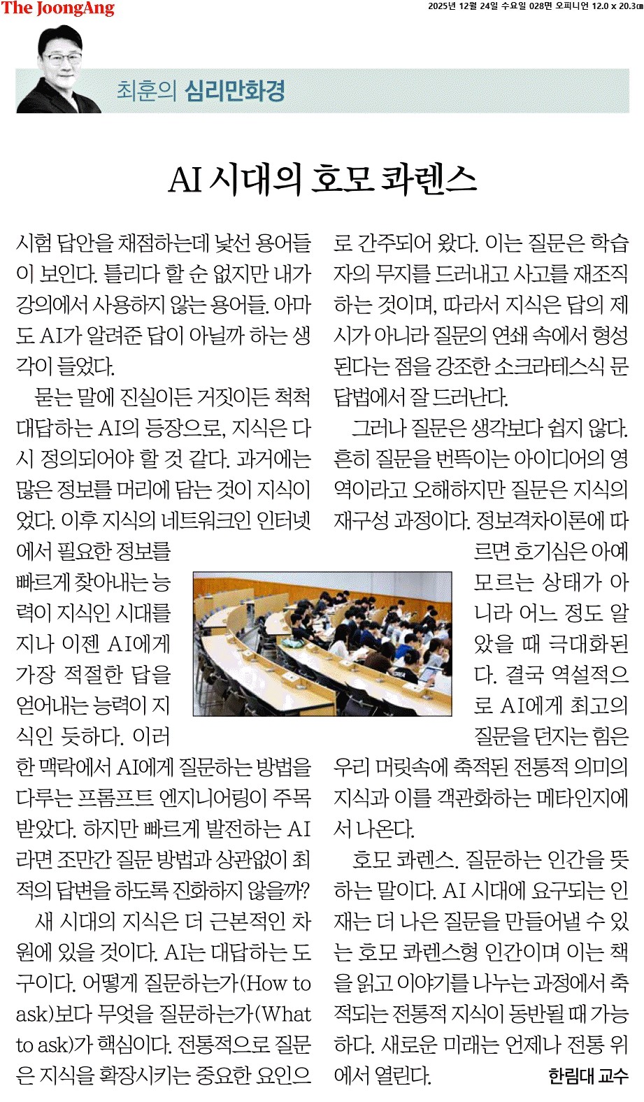 ⑤ 호모 콰렌스. 질문하는 인간을 뜻하는 말이다. AI 시대에 요구되는 인재는 더 나은 질문을 만들어낼 수 있는 호모 콰렌스형 인간이며 이는 책을 읽고 이야기를 나누는 과정에서 축적되는 전통적 지식이 동반될 때 가능하다. 새로운 미래는 언제나 전통 위에서 열린다.
