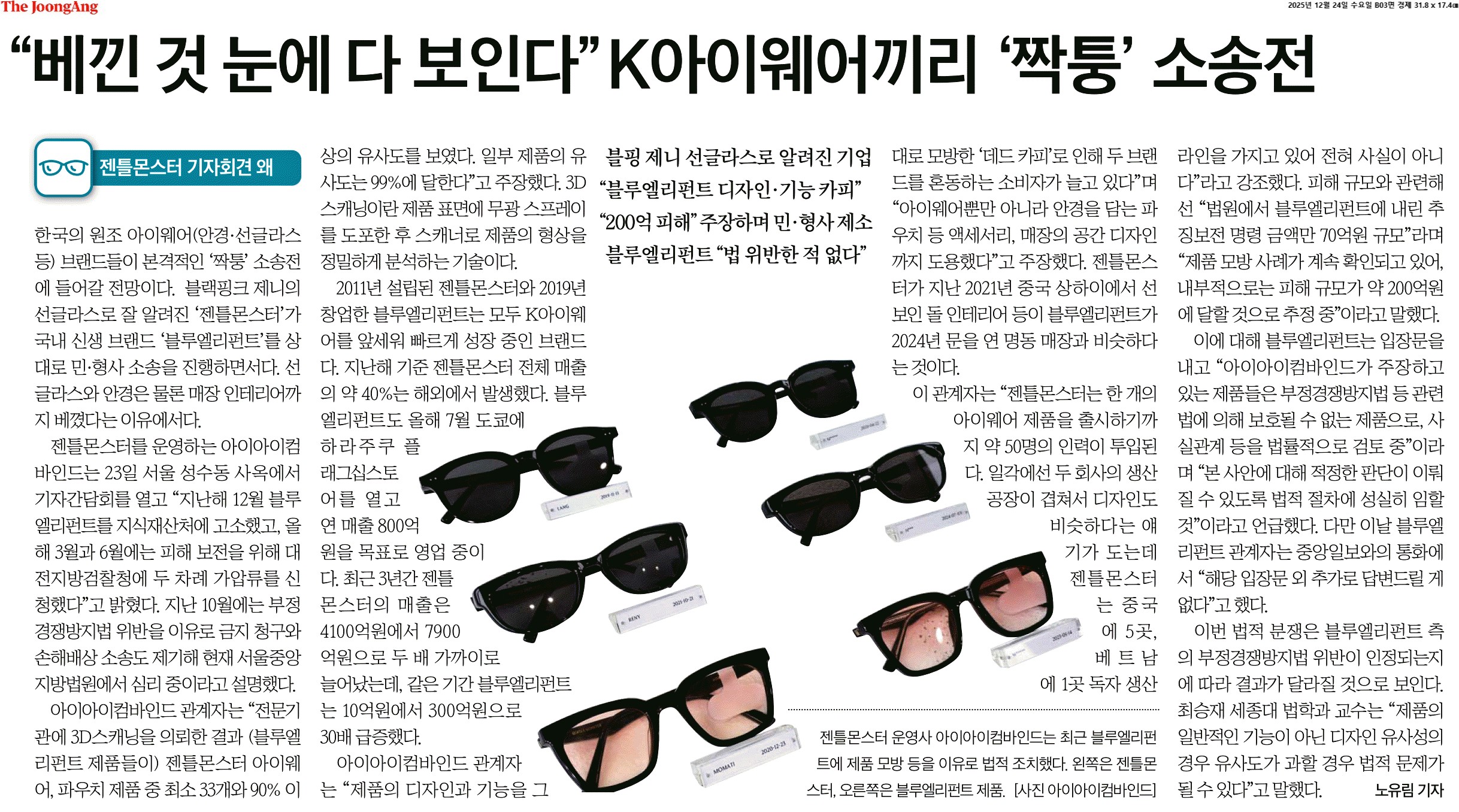 ② 젠틀몬스터를 운영하는 아이아이컴바인드는 23일 서울 성수동 사옥에서 기자간담회를 열고 “지난해 12월 블루엘리펀트를 지식재산처에 고소했고, 올해 3월과 6월에는 피해 보전을 위해 대전지방검찰청에 두 차례 가압류를 신청했다”고 밝혔다. 지난 10월에는 부정경쟁방지법 위반을 이유로 금지 청구와 손해배상 소송도 제기해 현재 서울중앙지방법원에서 심리 중이라고 설명했다.