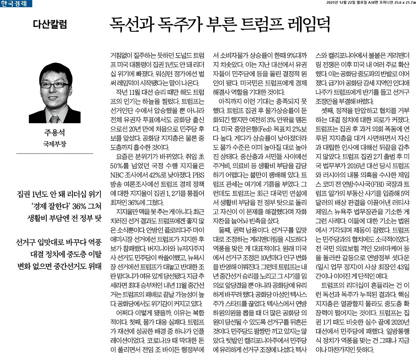 ⑤ 트럼프의 리더십이 흔들리는 건 이런 독선과 독주가 누적된 결과다. 핵심 지지층은 열광할지 몰라도 중도층 확장력이 떨어지는 것이다. 트럼프는 집권 1기 때도 비슷한 실수 끝에 2020년 대선에서 민주당에 패했다. 일방통행식 정치가 역풍을 맞는 건 그때나 지금이나 마찬가지인 듯하다.