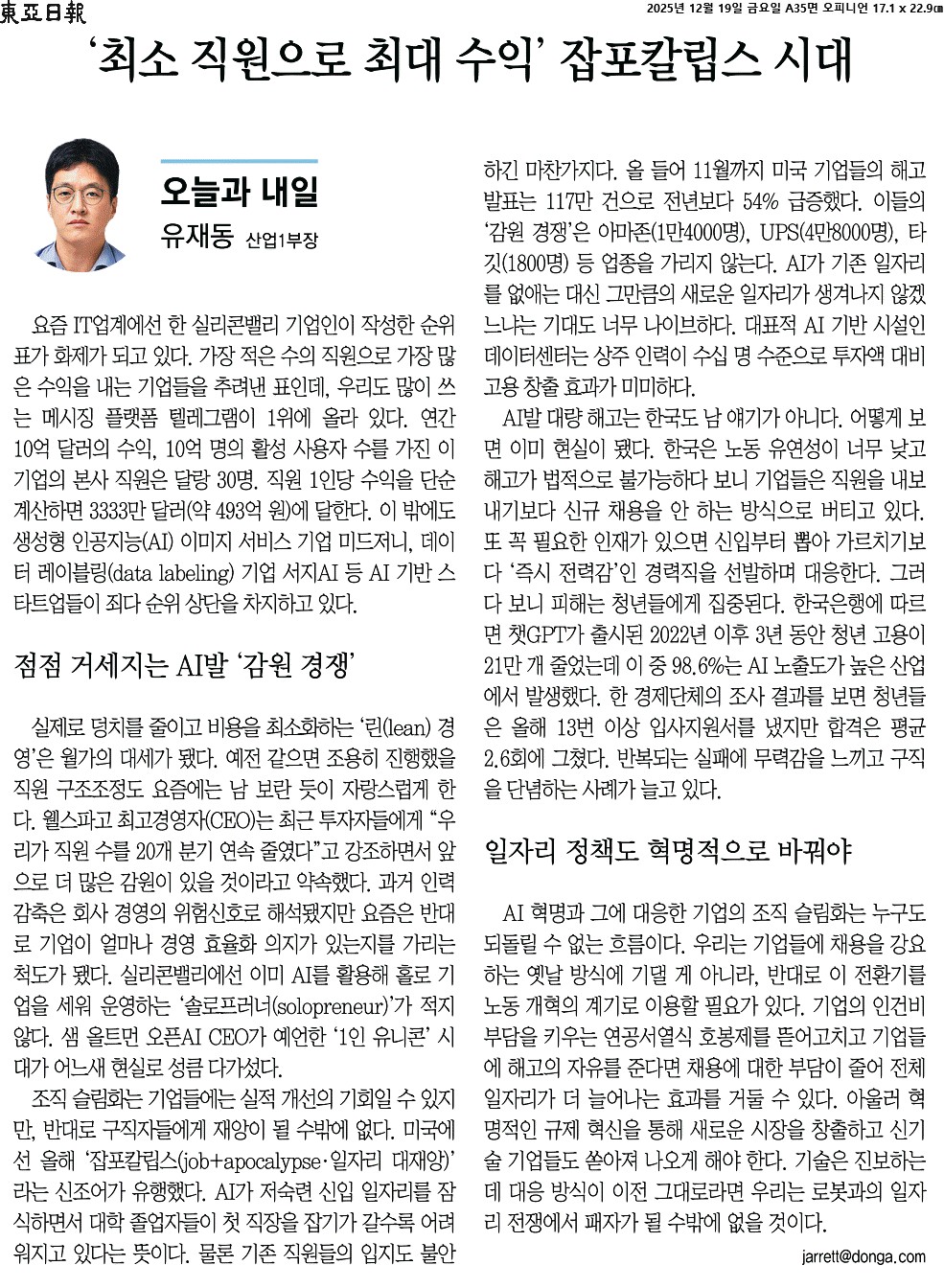 ③ 조직 슬림화는 기업들에는 실적 개선의 기회일 수 있지만, 반대로 구직자들에게 재앙이 될 수밖에 없다. 미국에선 올해 ‘잡포칼립스(job+apocalypse·일자리 대재앙)’라는 신조어가 유행했다. AI가 저숙련 신입 일자리를 잠식하면서 대학 졸업자들이 첫 직장을 잡기가 갈수록 어려워지고 있다는 뜻이다. 물론 기존 직원들의 입지도 불안하긴 마찬가지다.