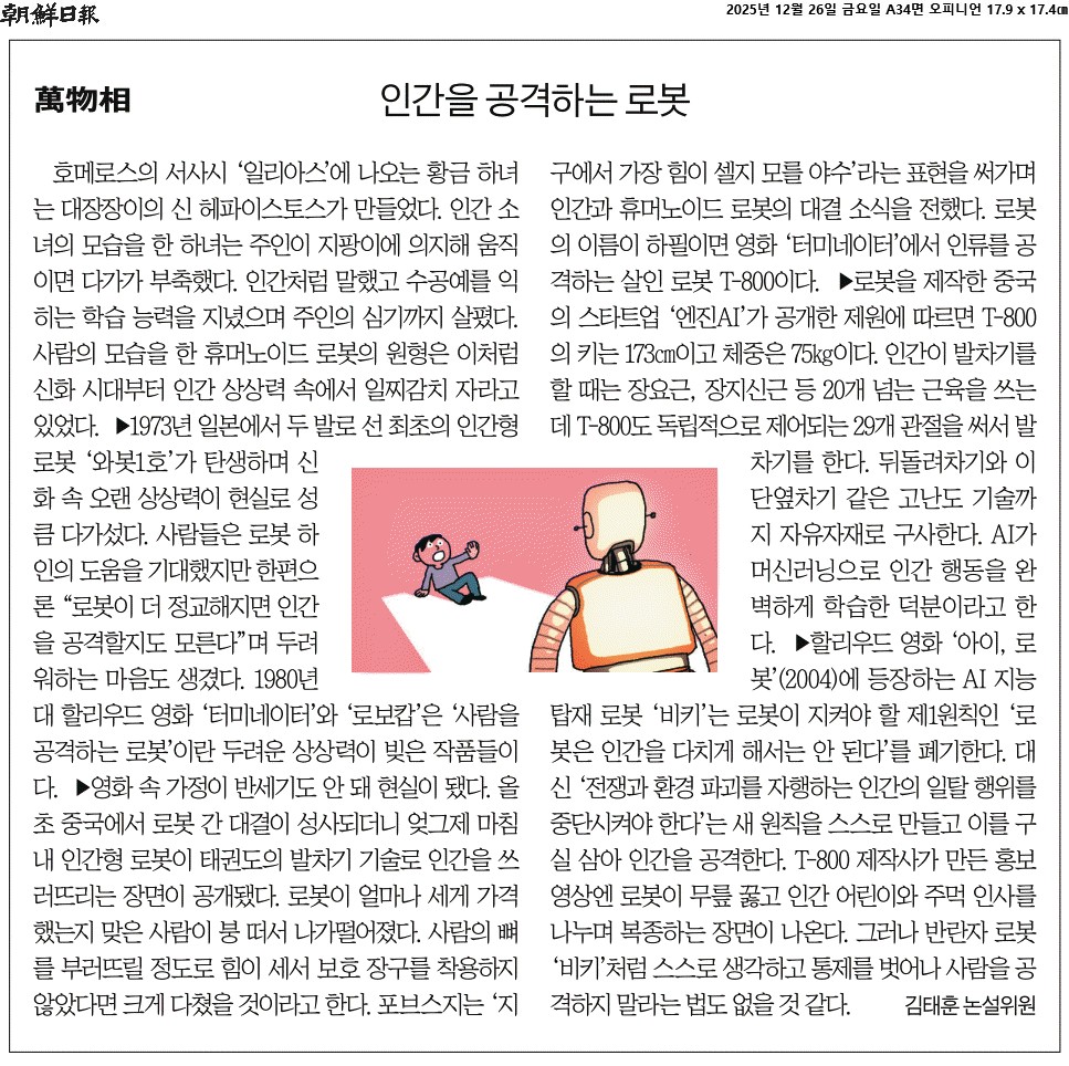 ③ 영화 속 가정이 반세기도 안 돼 현실이 됐다. 올 초 중국에서 로봇 간 대결이 성사되더니 엊그제 마침내 인간형 로봇이 태권도의 발차기 기술로 인간을 쓰러뜨리는 장면이 공개됐다. 로봇이 얼마나 세게 가격했는지 맞은 사람이 붕 떠서 나가떨어졌다. 사람의 뼈를 부러뜨릴 정도로 힘이 세서 보호 장구를 착용하지 않았다면 크게 다쳤을 것이라고 한다. 포브스지는 ‘지구에서 가장 힘이 셀지 모를 야수’라는 표현을 써가며 인간과 휴머노이드 로봇의 대결 소식을 전했다. 로봇의 이름이 하필이면 영화 ‘터미네이터’에서 인류를 공격하는 살인 로봇 T-800이다.