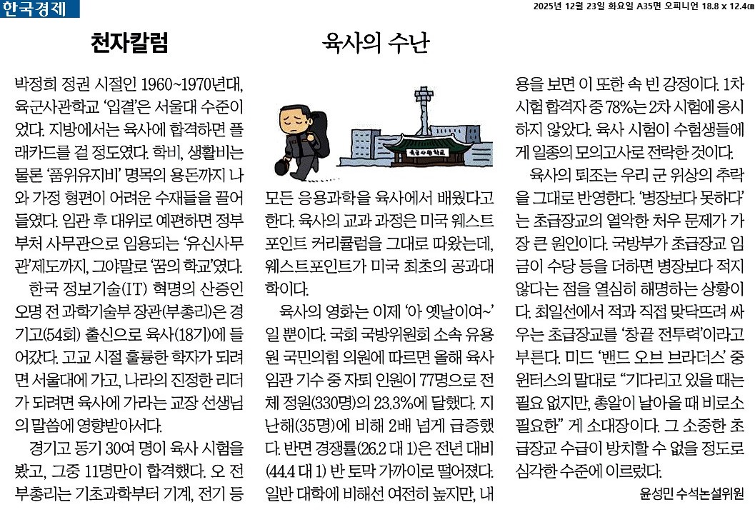 ④ 육사의 퇴조는 우리 군 위상의 추락을 그대로 반영한다. ‘병장보다 못하다’는 초급장교의 열악한 처우 문제가 가장 큰 원인이다. 국방부가 초급장교 임금이 수당 등을 더하면 병장보다 적지 않다는 점을 열심히 해명하는 상황이다.