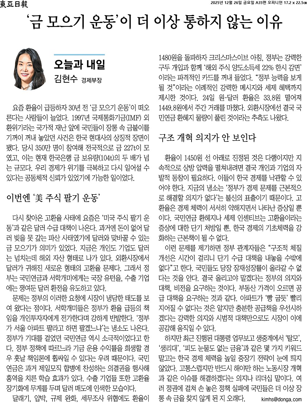 ② 다시 찾아온 고환율 사태에 요즘은 ‘미국 주식 팔기 운동’과 같은 달러 수급 대책이 나온다. 과거엔 돈이 없어 달러 빚을 못 갚는 파산 사태였기에 달러와 맞바꿀 수 있는 금 모으기가 의미가 있었다. 지금은 개인도 기업도 달러는 넘치는데 해외 자산 형태로 나가 있다. 외환시장에서 달러가 귀해진 새로운 형태의 고환율 문제다. 그래서 정부는 국민연금과 서학개미에게는 국장 유턴을, 수출 기업에는 쟁여둔 달러 환전을 유도하고 있다.