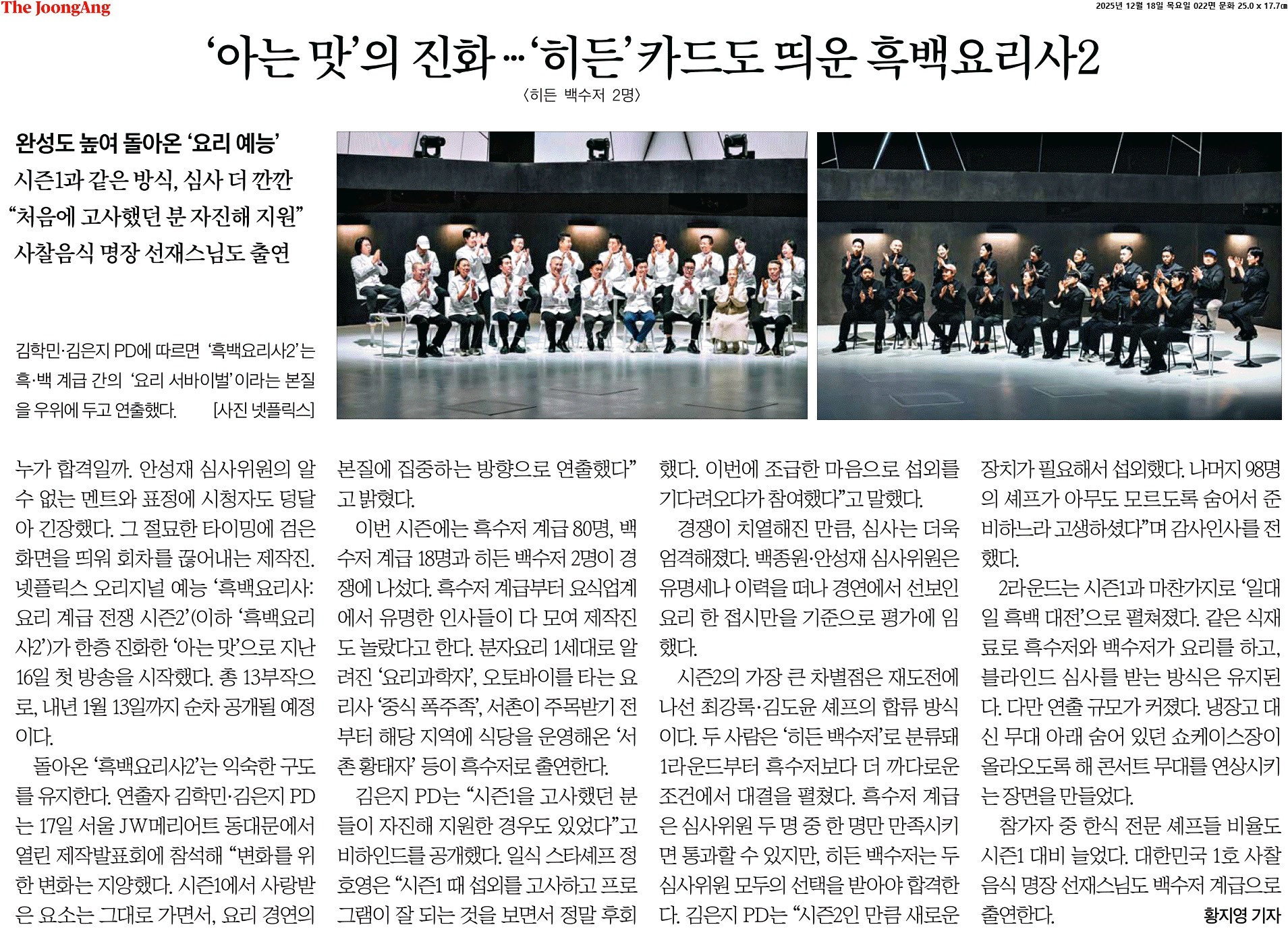 ⑤ 참가자 중엔 한식 전문 셰프들도 시즌1 대비 늘었다. 흑수저 계급 첫 생존자인 ‘술빚는 윤주모’는 “한식을 좀 알리는 계기가 되면 좋겠다는 개인적 바람이 있었다. 이번 시즌에 백수저 계급에서도 한식 전문가들이 많아 놀랐다”고 말했다. 대한민국 1호 사찰음식 명장 선재스님은 “한식이 세계적으로 훌륭한 음식임을 보여주기 위해 셰프들과 제작진 모두가 노력했다. 여기서 만난 99인의 수행자들이 음식을 어떻게 대하고 어떤 방식으로 음식을 만드는지 잘 지켜봐달라”고 당부했다. ‘흑백요리사2’는 내년 1월 13일까지 총 13부작이 순차 공개된다.