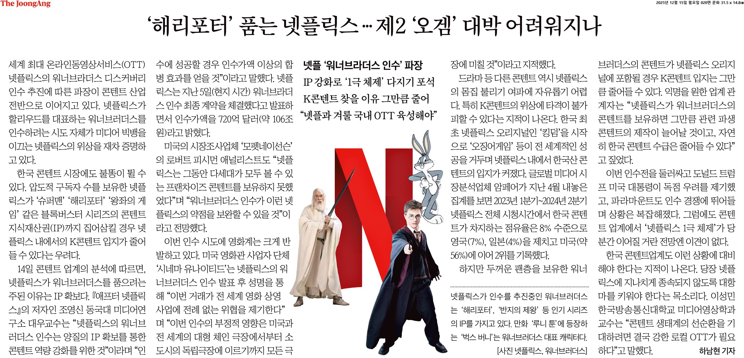 ② 한국 콘텐트 시장에도 불똥이 튈 수 있다. 압도적 구독자 수를 보유한 넷플릭스가 ‘슈퍼맨’ ‘해리포터’ ‘왕좌의 게임’ 같은 블록버스터 시리즈의 콘텐트 지식재산권(IP)까지 집어삼킬 경우 넷플릭스 내에서의 K콘텐트 입지가 줄어들 수 있다는 우려다.