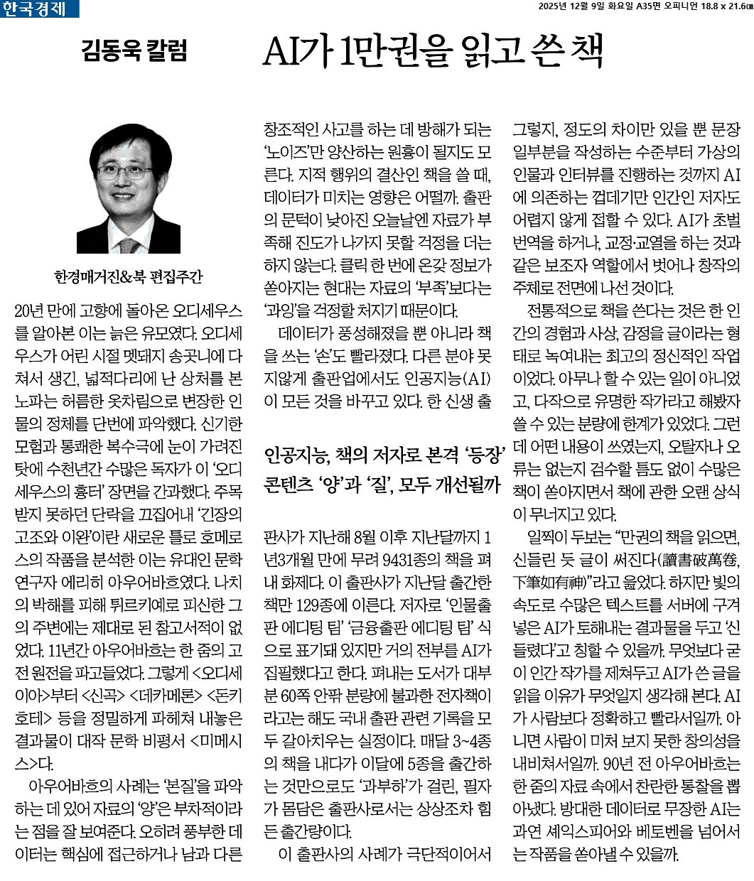 ③ 데이터가 풍성해졌을 뿐 아니라 책을 쓰는 ‘손’도 빨라졌다. 다른 분야 못지않게 출판업에서도 인공지능(AI)이 모든 것을 바꾸고 있다. 한 신생 출판사가 지난해 8월 이후 지난달까지 1년3개월 만에 무려 9431종의 책을 펴내 화제다.