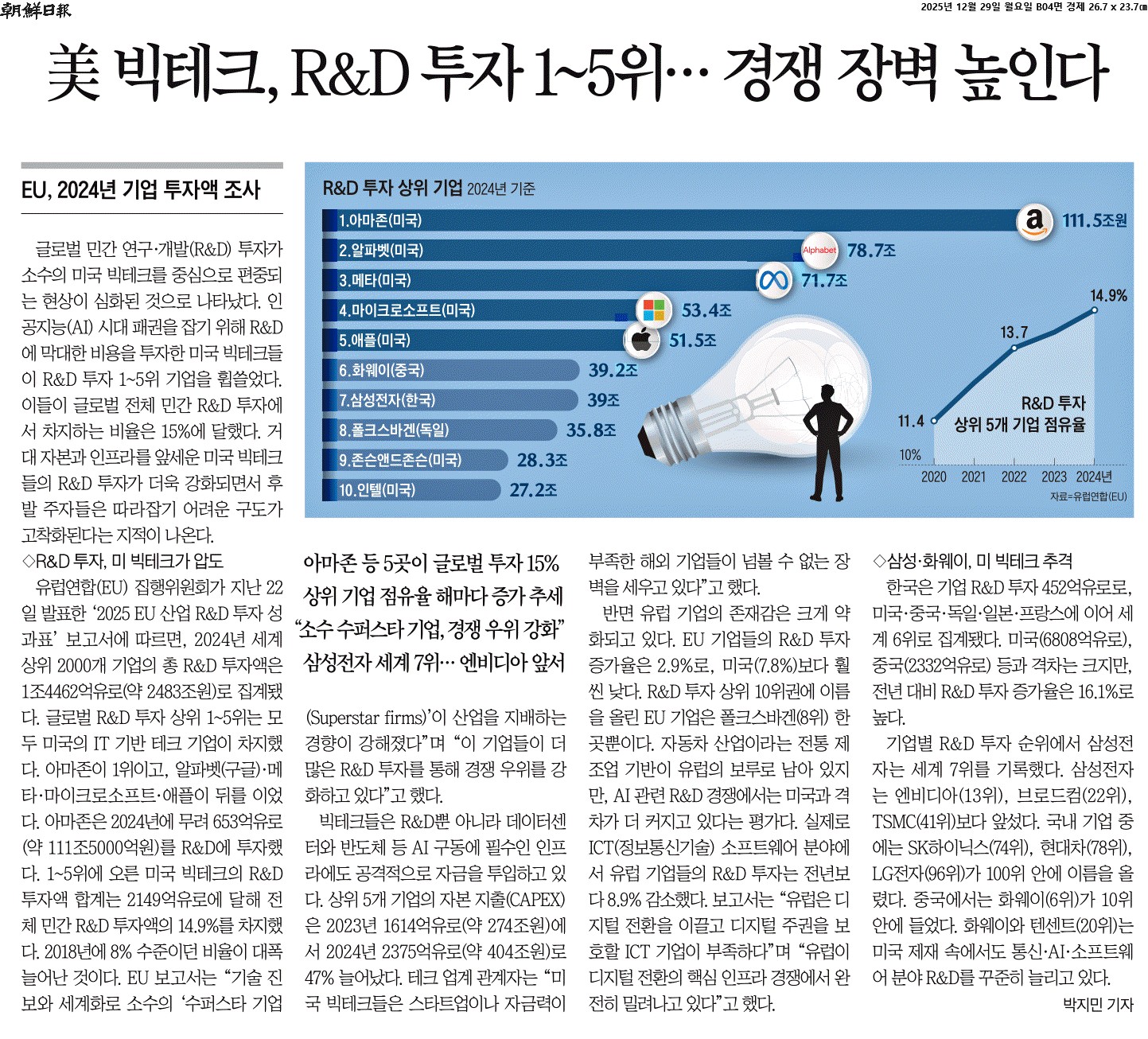 ② 글로벌 R&D 투자 상위 1~5위는 모두 미국의 IT 기반 테크 기업이 차지했다. 아마존이 1위이고, 알파벳(구글)·메타·마이크로소프트·애플이 뒤를 이었다. 아마존은 2024년에 무려 653억유로(약 111조5000억원)를 R&D에 투자했다. 1~5위에 오른 미국 빅테크의 R&D 투자액 합계는 2149억유로에 달해 전체 민간 R&D 투자액의 14.9%를 차지했다. 2018년에 8% 수준이던 비율이 대폭 늘어난 것이다. EU 보고서는 “기술 진보와 세계화로 소수의 ‘수퍼스타 기업(Superstar firms)’이 산업을 지배하는 경향이 강해졌다”며 “이 기업들이 더 많은 R&D 투자를 통해 경쟁 우위를 강화하고 있다”고 했다.