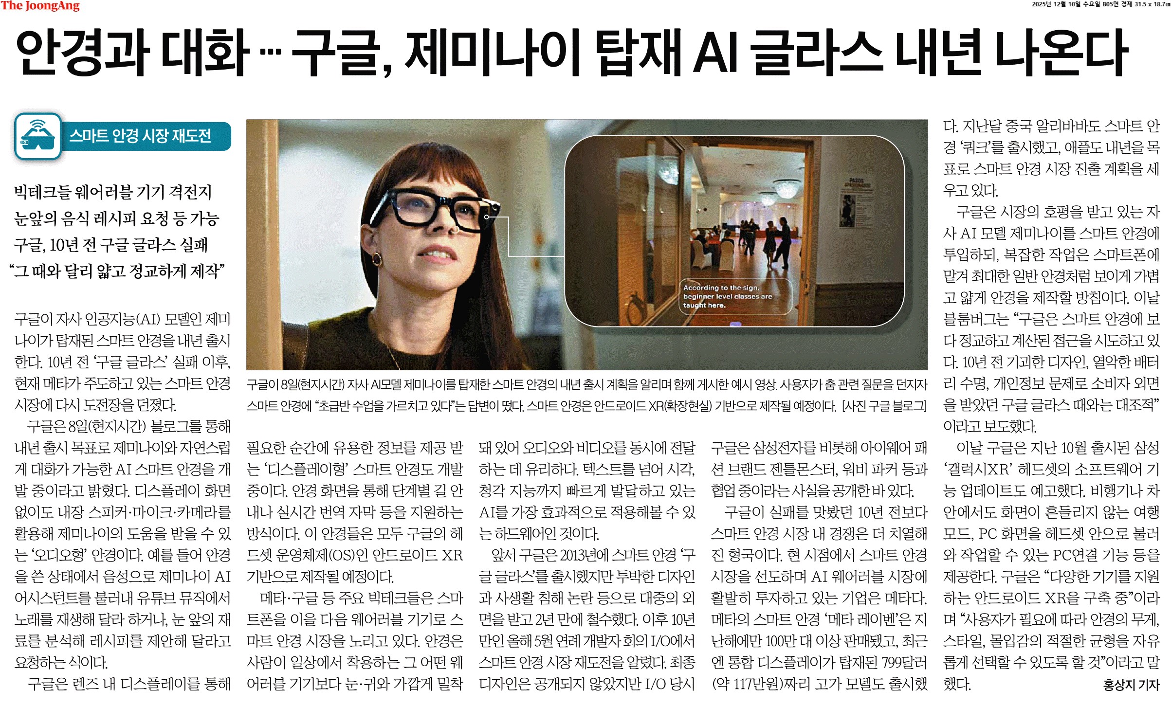 ① 구글이 자사 인공지능(AI) 모델인 제미나이가 탑재된 스마트 안경을 내년 출시한다. 10년 전 ‘구글 글라스’ 실패 이후, 현재 메타가 주도하고 있는 스마트 안경 시장에 다시 도전장을 던졌다.