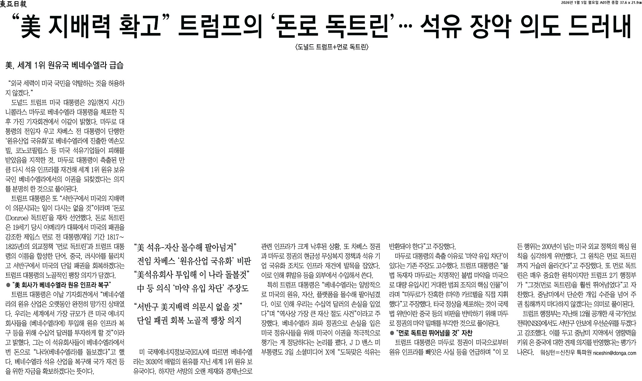 ② 트럼프 대통령은 또 “서반구에서 미국의 지배력이 의문시되는 일이 다시는 없을 것”이라며 ‘돈로(Donroe) 독트린’을 재차 선언했다. 돈로 독트린은 19세기 당시 아메리카 대륙에서 미국의 패권을 강조한 제임스 먼로 전 대통령(재임 기간 1817∼1825년)의 외교정책 ‘먼로 독트린’과 트럼프 대통령의 이름을 합성한 단어. 중국, 러시아를 물리치고 서반구에서 미국의 단일 패권을 회복하겠다는 트럼프 대통령의 노골적인 팽창 의지가 담겼다.