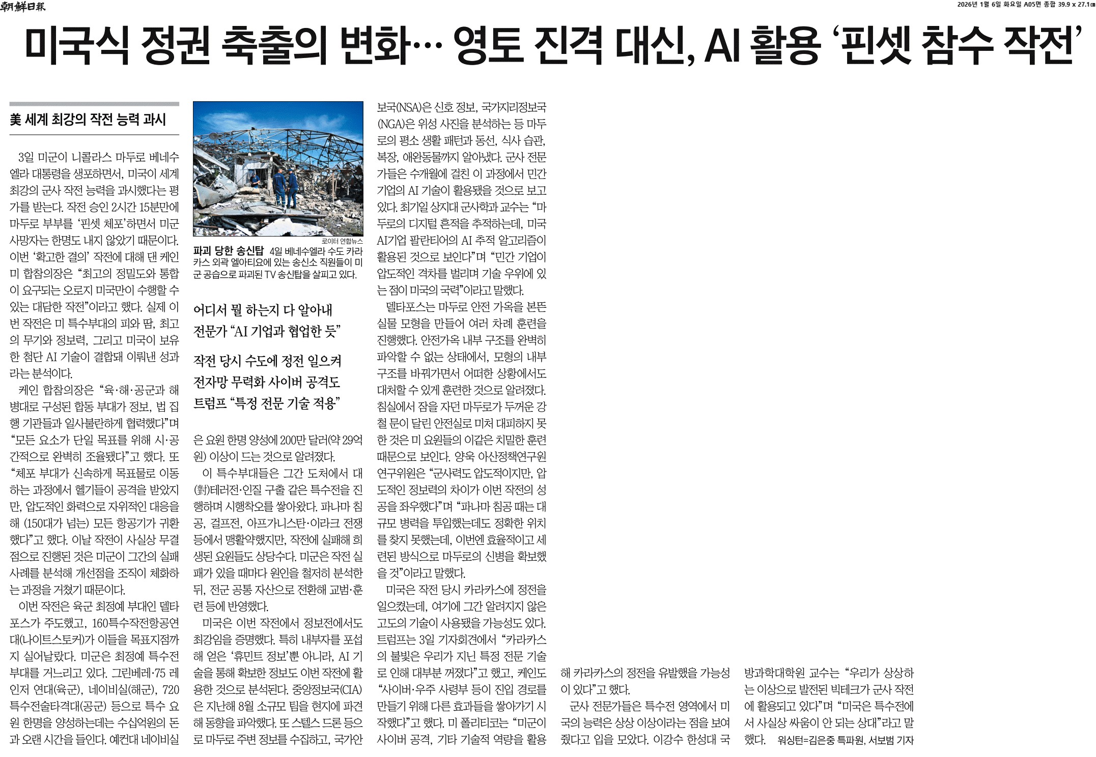 ① 3일 미군이 니콜라스 마두로 베네수엘라 대통령을 생포하면서, 미국이 세계 최강의 군사 작전 능력을 과시했다는 평가를 받는다. 작전 승인 2시간 15분만에 마두로 부부를 ‘핀셋 체포’하면서 미군 사망자는 한명도 내지 않았기 때문이다. 이번 ‘확고한 결의’ 작전에 대해 댄 케인 미 합참의장은 “최고의 정밀도와 통합이 요구되는 오로지 미국만이 수행할 수 있는 대담한 작전”이라고 했다. 실제 이번 작전은 미 특수부대의 피와 땀, 최고의 무기와 정보력, 그리고 미국이 보유한 첨단 AI 기술이 결합돼 이뤄낸 성과라는 분석이다.