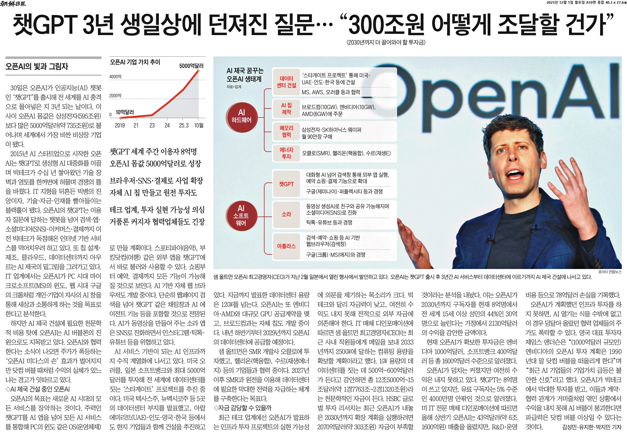 ① 30일은 오픈AI가 인공지능(AI) 챗봇인 ‘챗GPT’를 출시해 전 세계를 AI 충격으로 몰아넣은 지 3년 되는 날이다. 이 사이 오픈AI 몸값은 삼성전자(595조원)보다 많은 5000억달러(약 735조원)로 불어나며 세계에서 가장 비싼 비상장 기업이 됐다.