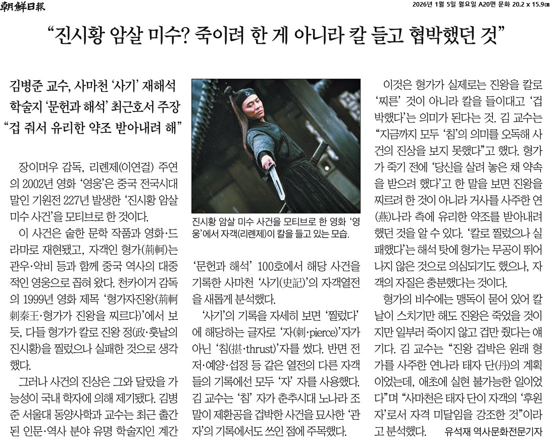 ② 그러나 사건의 진상은 그와 달랐을 가능성이 국내 학자에 의해 제기됐다. 김병준 서울대 동양사학과 교수는 최근 출간된 인문·역사 분야 유명 학술지인 계간 ‘문헌과 해석’ 100호에서 해당 사건을 기록한 사마천 ‘사기(史記)’의 자객열전을 새롭게 분석했다.