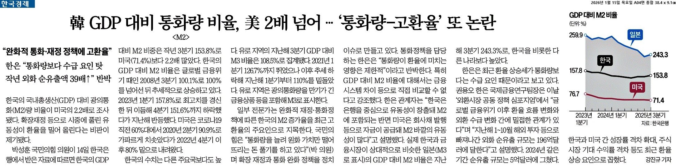 ① 한국의 국내총생산(GDP) 대비 광의통화(M2)량 비율이 미국의 2.2배로 조사됐다. 확장재정 등으로 시중에 풀린 유동성이 환율을 밀어 올린다는 비판이 제기됐다.