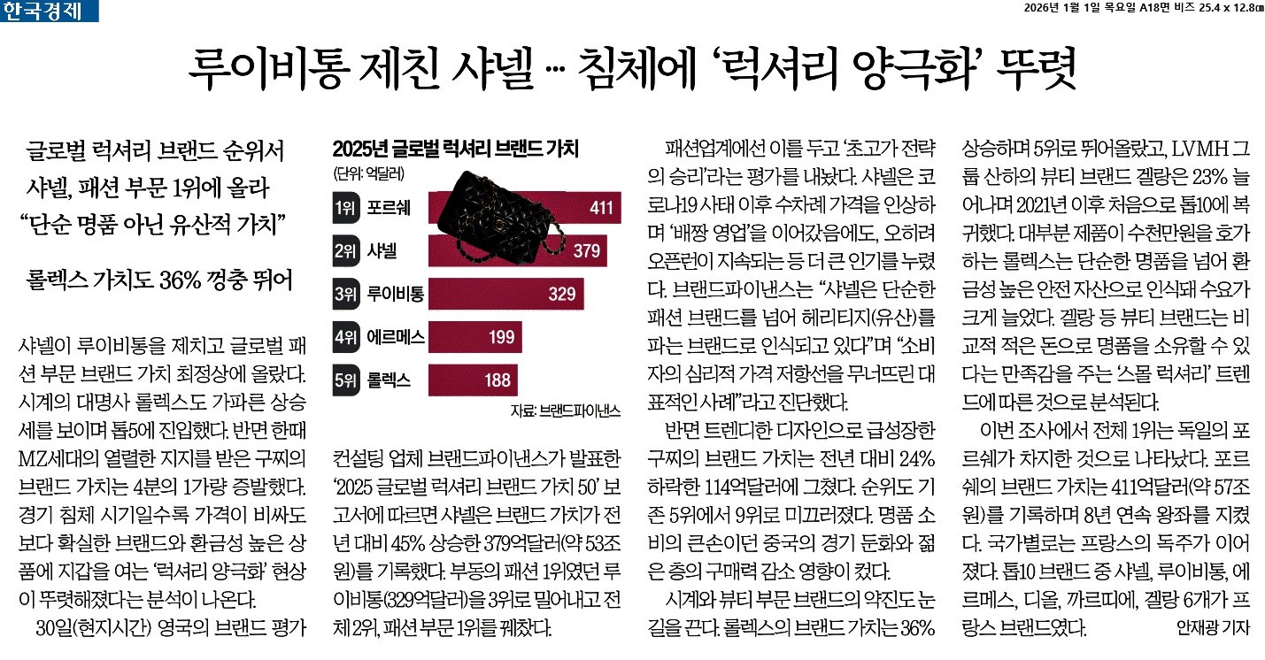 ② 30일(현지시간) 영국의 브랜드 평가 컨설팅 업체 브랜드파이낸스가 발표한 ‘2025 글로벌 럭셔리 브랜드 가치 50’ 보고서에 따르면 샤넬은 브랜드 가치가 전년 대비 45% 상승한 379억달러(약 53조원)를 기록했다. 부동의 패션 1위였던 루이비통(329억달러)을 3위로 밀어내고 전체 2위, 패션 부문 1위를 꿰찼다.