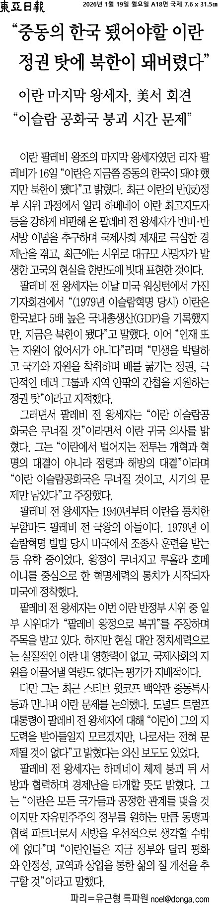 ① 이란 팔레비 왕조의 마지막 왕세자였던 리자 팔레비가 16일 “이란은 지금쯤 중동의 한국이 돼야 했지만 북한이 됐다”고 밝혔다. 최근 이란의 반(反)정부 시위 과정에서 알리 하메네이 이란 최고지도자 등을 강하게 비판해 온 팔레비 전 왕세자가 반미·반서방 이념을 추구하며 국제사회 제재로 극심한 경제난을 겪고, 최근에는 시위로 대규모 사망자가 발생한 고국의 현실을 한반도에 빗대 표현한 것이다.