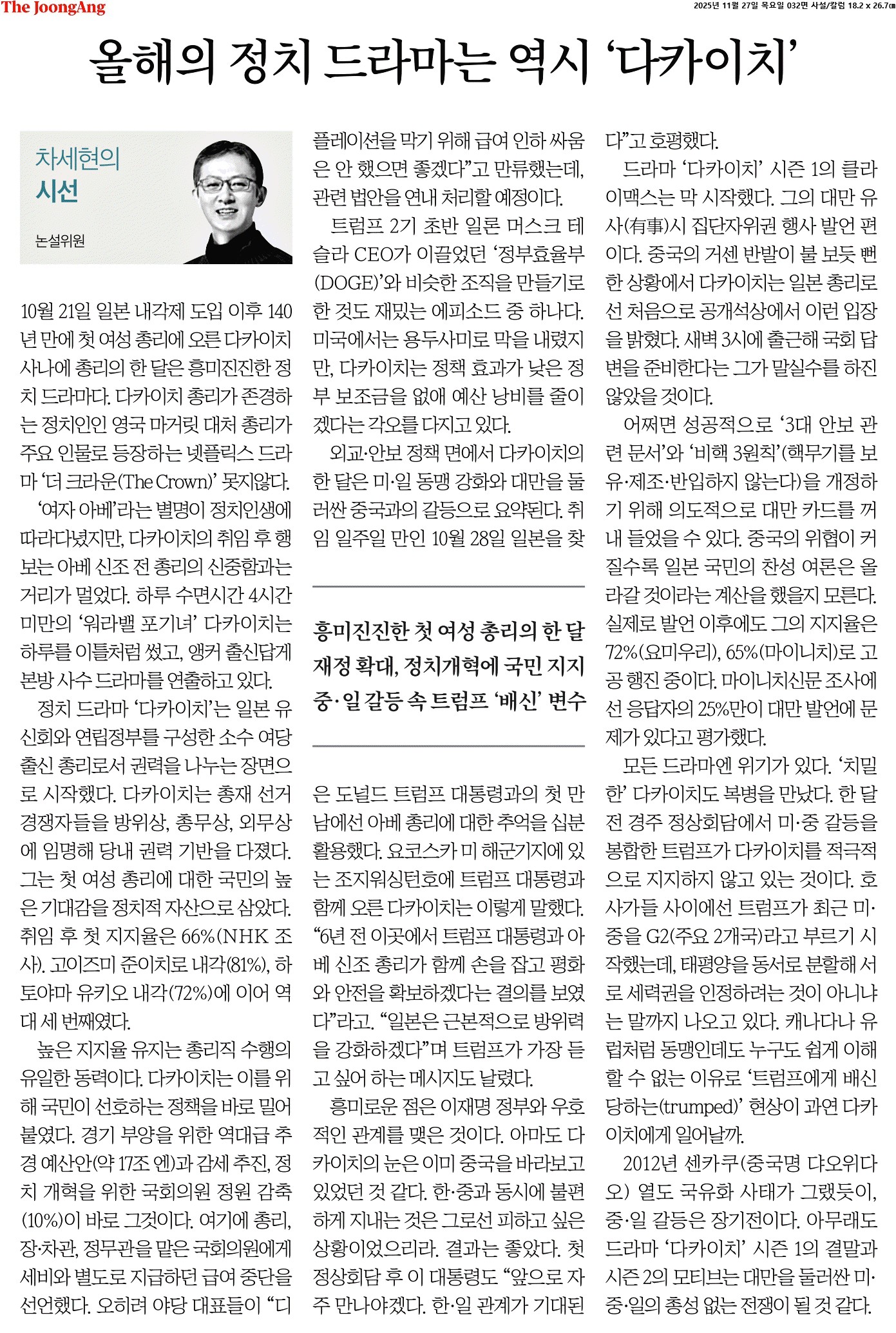 ① 10월 21일 일본 내각제 도입 이후 140년 만에 첫 여성 총리에 오른 다카이치 사나에 총리의 한 달은 흥미진진한 정치 드라마다. 다카이치 총리가 존경하는 정치인인 영국 마거릿 대처 총리가 주요 인물로 등장하는 넷플릭스 드라마 ‘더 크라운(The Crown)’ 못지않다.