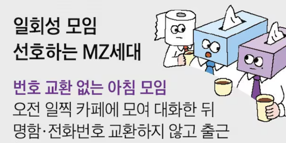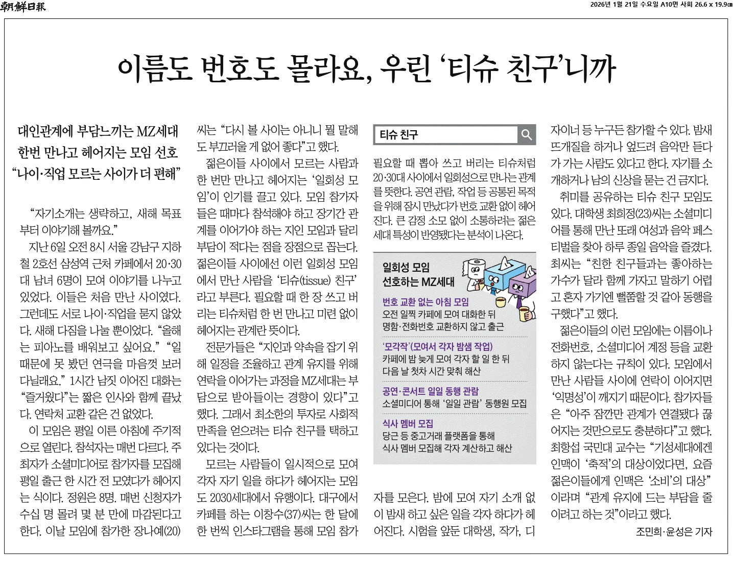 ② 젊은이들 사이에서 모르는 사람과 한 번만 만나고 헤어지는 ‘일회성 모임’이 인기를 끌고 있다. 모임 참가자들은 때마다 참석해야 하고 장기간 관계를 이어가야 하는 지인 모임과 달리 부담이 적다는 점을 장점으로 꼽는다. 젊은이들 사이에선 이런 일회성 모임에서 만난 사람을 ‘티슈(tissue) 친구’라고 부른다. 필요할 때 한 장 쓰고 버리는 티슈처럼 한 번 만나고 미련 없이 헤어지는 관계란 뜻이다.