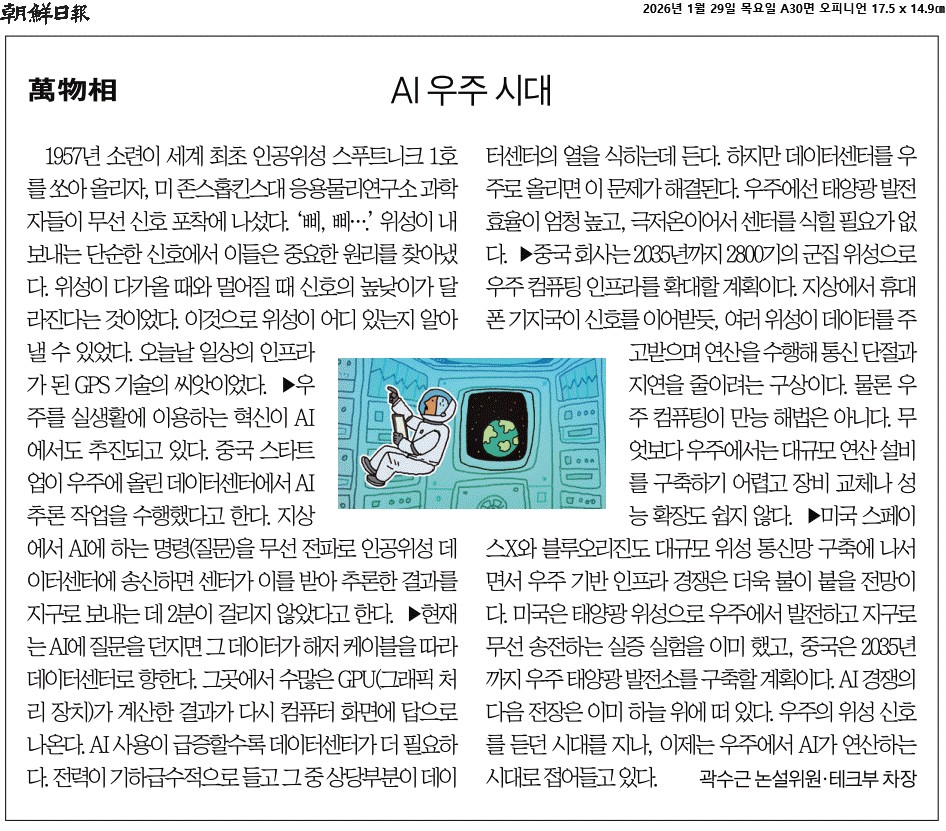 ② 우주를 실생활에 이용하는 혁신이 AI에서도 추진되고 있다. 중국 스타트업이 우주에 올린 데이터센터에서 AI 추론 작업을 수행했다고 한다. 지상에서 AI에 하는 명령(질문)을 무선 전파로 인공위성 데이터센터에 송신하면 센터가 이를 받아 추론한 결과를 지구로 보내는 데 2분이 걸리지 않았다고 한다.