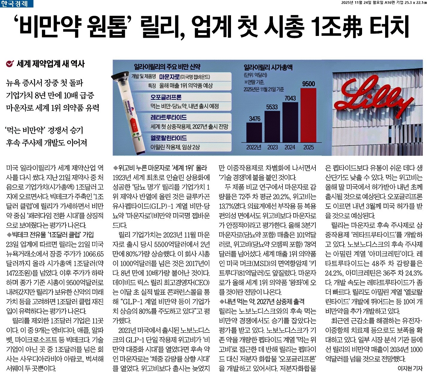 ① 미국 일라이릴리가 세계 제약산업 역사를 다시 썼다. 지난 21일 제약사 중 처음으로 기업가치(시가총액) 1조달러 고지에 오르면서다. 빅테크가 주축인 ‘1조달러 클럽’에 릴리가 가세하면서 비만약 중심 ‘패러다임 전환 시대’를 상징적으로 보여줬다는 평가가 나온다.