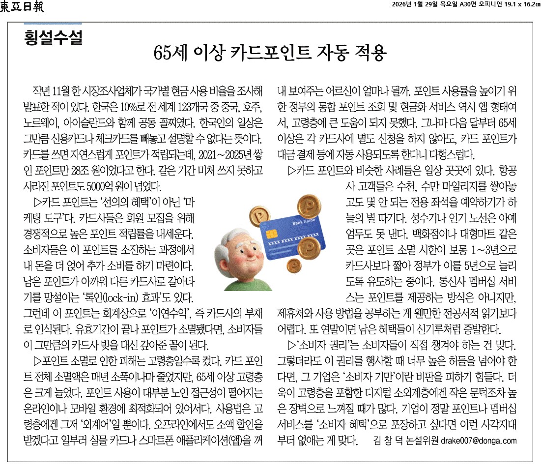 ① 작년 11월 한 시장조사업체가 국가별 현금 사용 비율을 조사해 발표한 적이 있다. 한국은 10%로 전 세계 123개국 중 중국, 호주, 노르웨이, 아이슬란드와 함께 공동 꼴찌였다. 한국인의 일상은 그만큼 신용카드나 체크카드를 빼놓고 설명할 수 없다는 뜻이다. 카드를 쓰면 자연스럽게 포인트가 적립되는데, 2021∼2025년 쌓인 포인트만 28조 원이었다고 한다. 같은 기간 미처 쓰지 못하고 사라진 포인트도 5000억 원이 넘었다.