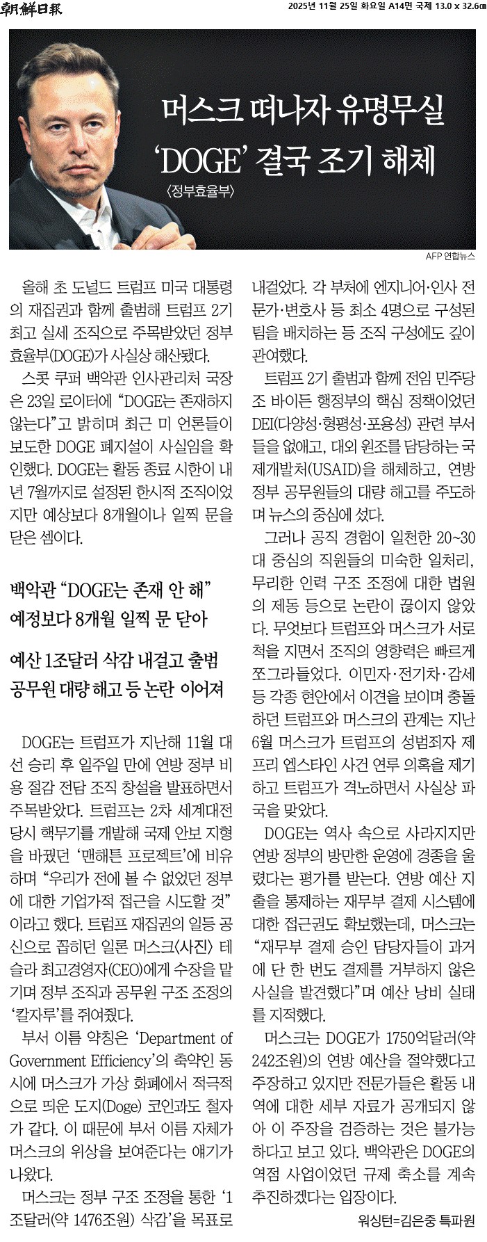 ① 올해 초 도널드 트럼프 미국 대통령의 재집권과 함께 출범해 트럼프 2기 최고 실세 조직으로 주목받았던 정부효율부(DOGE)가 사실상 해산됐다. 스콧 쿠퍼 백악관 인사관리처 국장은 23일 로이터에 “DOGE는 존재하지 않는다”고 밝히며 최근 미 언론들이 보도한 DOGE 폐지설이 사실임을 확인했다. DOGE는 활동 종료 시한이 내년 7월까지로 설정된 한시적 조직이었지만 예상보다 8개월이나 일찍 문을 닫은 셈이다.