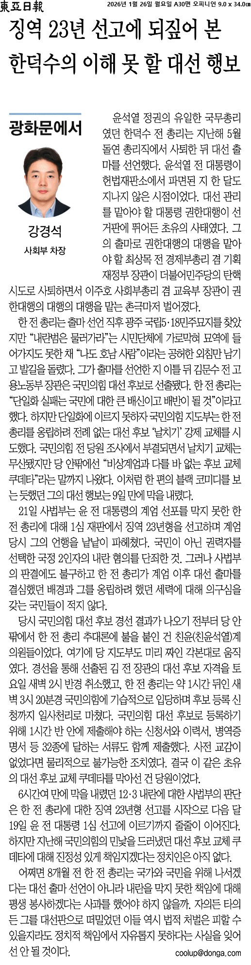 ⑤ 어쩌면 8개월 전 한 전 총리는 국가와 국민을 위해 나서겠다는 대선 출마 선언이 아니라 내란을 막지 못한 책임에 대해 평생 봉사하겠다는 사과를 했어야 하지 않을까. 자의든 타의든 그를 대선판으로 떠밀었던 이들 역시 법적 처벌은 피할 수 있을지라도 정치적 책임에서 자유롭지 못하다는 사실을 잊어선 안 될 것이다.