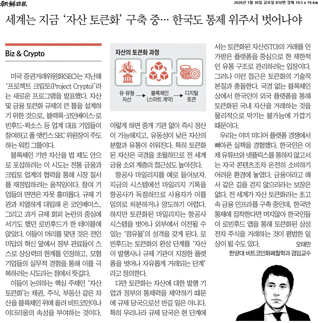 ④ 다만 토큰화는 자산에 대한 발행 기업과 정부의 통제력을 제약하기 때문에 규제 당국으로선 반길 일은 아니다. 특히 우리나라 규제 당국은 현 단계에서는 토큰화된 자산(STO)의 거래를 인가받은 플랫폼을 중심으로 한 제한적인 유통 구조로 관리하려는 입장이다. 그러나 이런 접근은 토큰화의 기술적 본질과 충돌한다. 국경 없는 블록체인상에서 한국인이 외국 플랫폼을 통해 토큰화된 국내 자산을 거래하는 것을 물리적으로 막기는 불가능에 가깝기 때문이다.