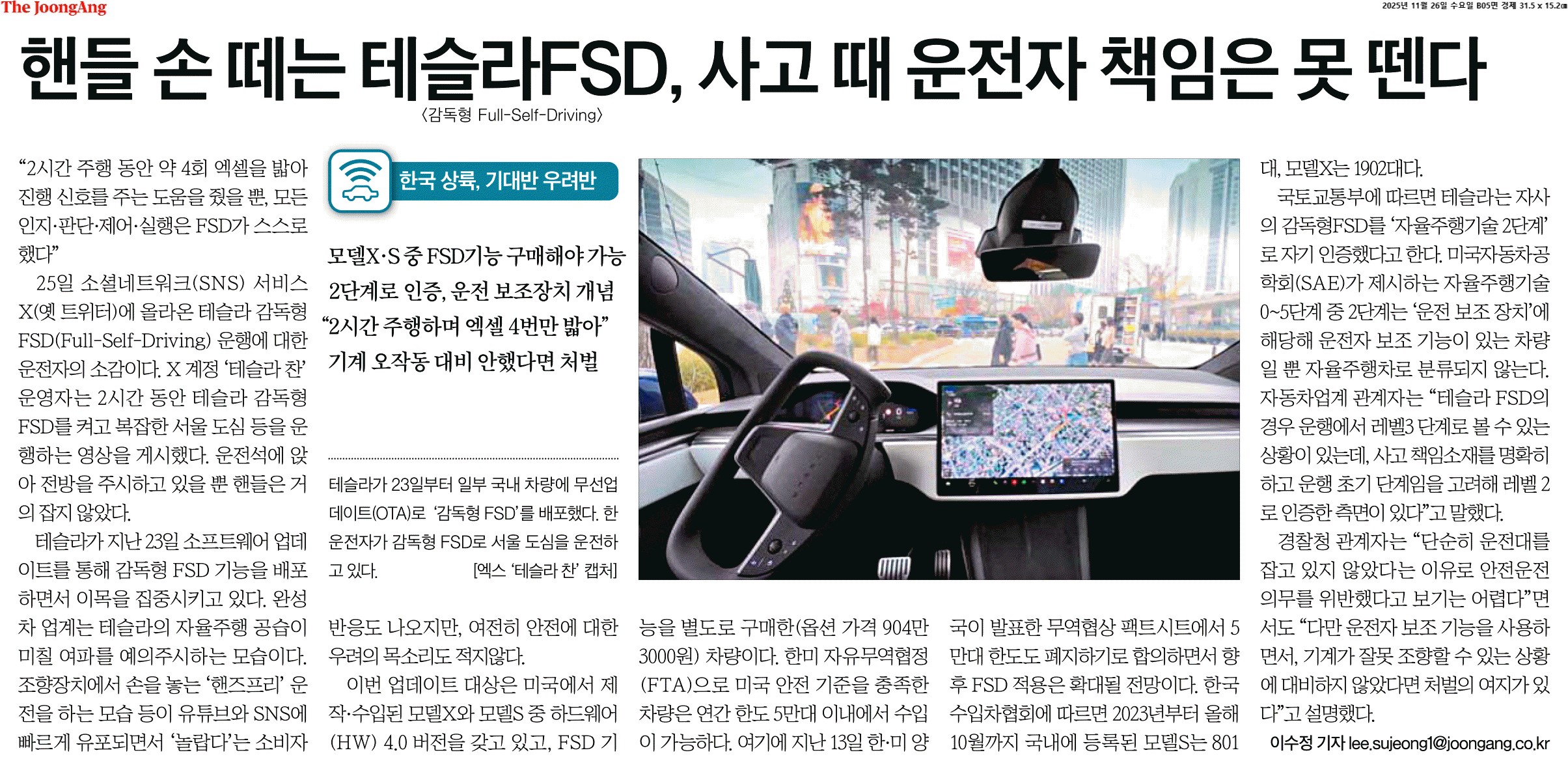 ① “2시간 주행 동안 약 4회 엑셀을 밟아 진행 신호를 주는 도움을 줬을 뿐, 모든 인지·판단·제어·실행은 FSD가 스스로 했다”
