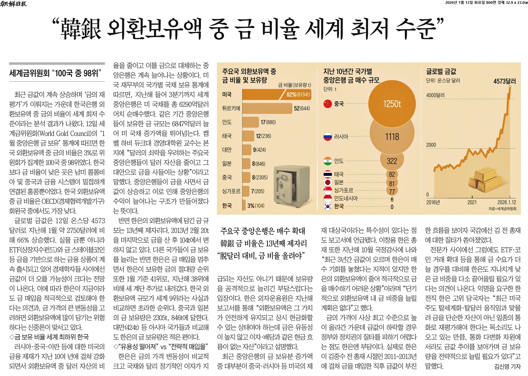 ① 최근 금값이 계속 상승하며 ‘금의 재평가’가 이뤄지는 가운데 한국은행 외환보유액 중 금의 비율이 세계 최저 수준이라는 분석 결과가 나왔다. 12일 세계금위원회(World Gold Council)의 ‘1월 중앙은행 금 보유’ 통계에 따르면 한국 외환보유액 중 금의 비율은 3%로 위원회가 집계한 100국 중 98위였다. 한국보다 금 비율이 낮은 곳은 남미 콜롬비아 및 중국과 금융 시스템이 밀접하게 연결된 홍콩뿐이었다. 한국 외환보유액 중 금 비율은 OECD(경제협력개발기구) 회원국 중에서도 가장 낮다.