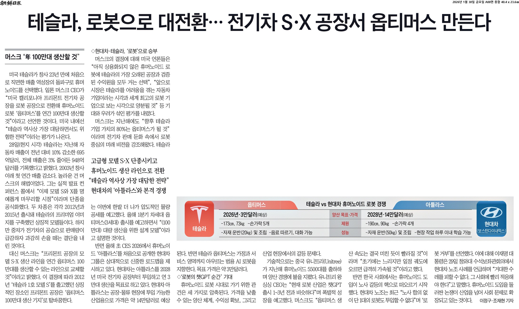 ① 미국 테슬라가 창사 23년 만에 처음으로 직면한 매출 역성장의 돌파구로 휴머노이드를 선택했다. 일론 머스크 CEO가 “미국 캘리포니아 프리몬트 전기차 공장을 로봇 공장으로 전환해 휴머노이드 로봇 ‘옵티머스’를 연간 100만대 생산할 것”이라고 선언한 것이다. 미국 내에선 “테슬라 역사상 가장 대담하면서도 위험한 전략”이라는 평가가 나온다.