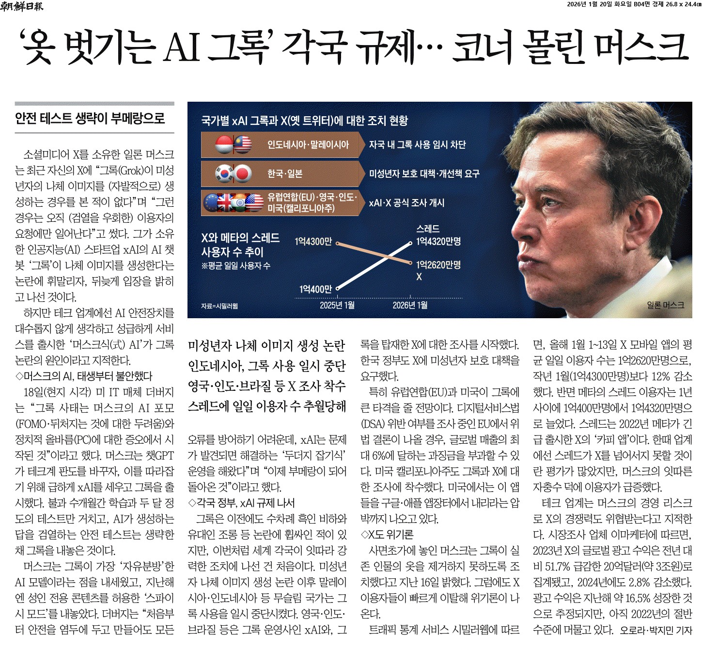 ① 소셜미디어 X를 소유한 일론 머스크는 최근 자신의 X에 “그록(Grok)이 미성년자의 나체 이미지를 (자발적으로) 생성하는 경우를 본 적이 없다”며 “그런 경우는 오직 (검열을 우회한) 이용자의 요청에만 일어난다”고 썼다. 그가 소유한 인공지능(AI) 스타트업 xAI의 AI 챗봇 ‘그록’이 나체 이미지를 생성한다는 논란에 휘말리자, 뒤늦게 입장을 밝히고 나선 것이다.