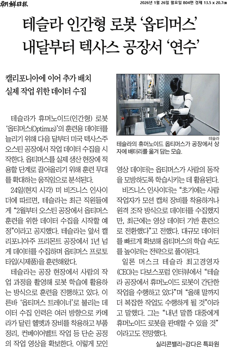 ② 24일(현지 시각) 비즈니스 인사이더는 이르면 2월부터 테슬라가 미 오스틴 공장에서 옵티머스가 잘 작동하도록 훈련시킬 계획이라고 보도했다. 테슬라는 앞서 1년 넘게 캘리포니아주 프리몬트 공장에서도 옵티머스를 훈련해왔다.