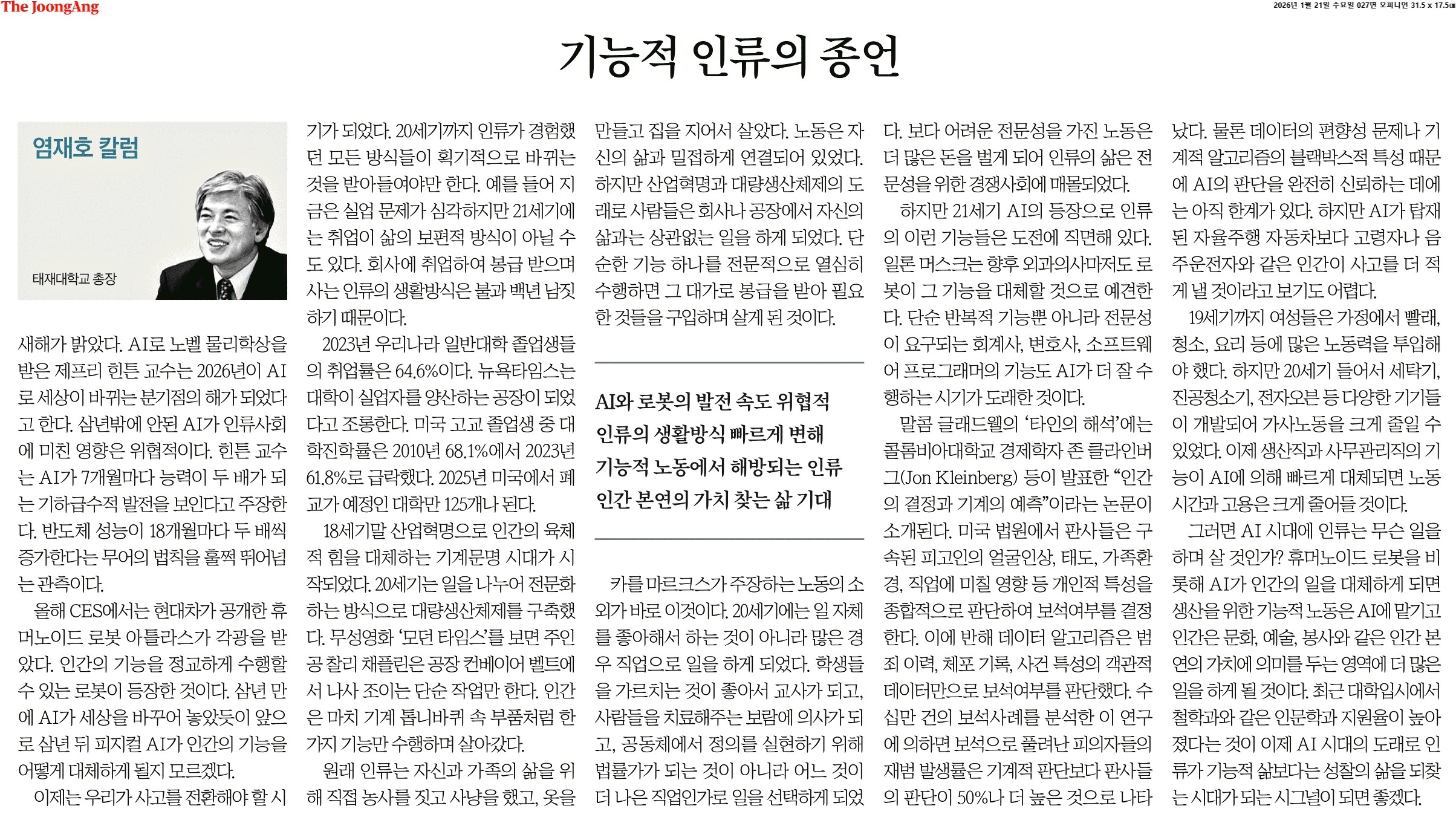 ① 새해가 밝았다. AI로 노벨 물리학상을 받은 제프리 힌튼 교수는 2026년이 AI로 세상이 바뀌는 분기점의 해가 되었다고 한다. 삼년밖에 안된 AI가 인류사회에 미친 영향은 위협적이다. 힌튼 교수는 AI가 7개월마다 능력이 두 배가 되는 기하급수적 발전을 보인다고 주장한다. 반도체 성능이 18개월마다 두 배씩 증가한다는 무어의 법칙을 훌쩍 뛰어넘는 관측이다.