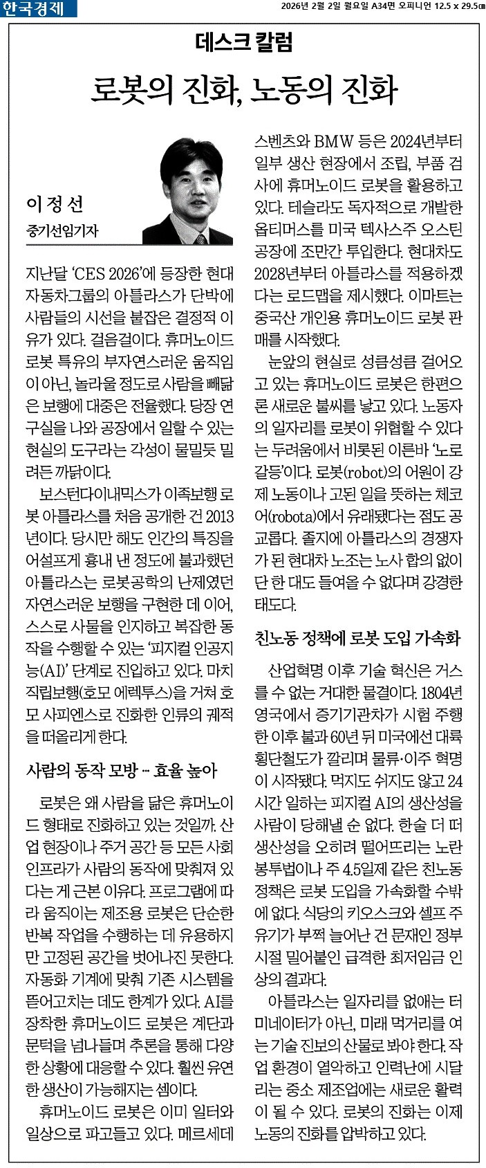 ⑤ 아틀라스는 일자리를 없애는 터미네이터가 아닌, 미래 먹거리를 여는 기술 진보의 산물로 봐야 한다. 작업 환경이 열악하고 인력난에 시달리는 중소 제조업에는 새로운 활력이 될 수 있다. 로봇의 진화는 이제 노동의 진화를 압박하고 있다.