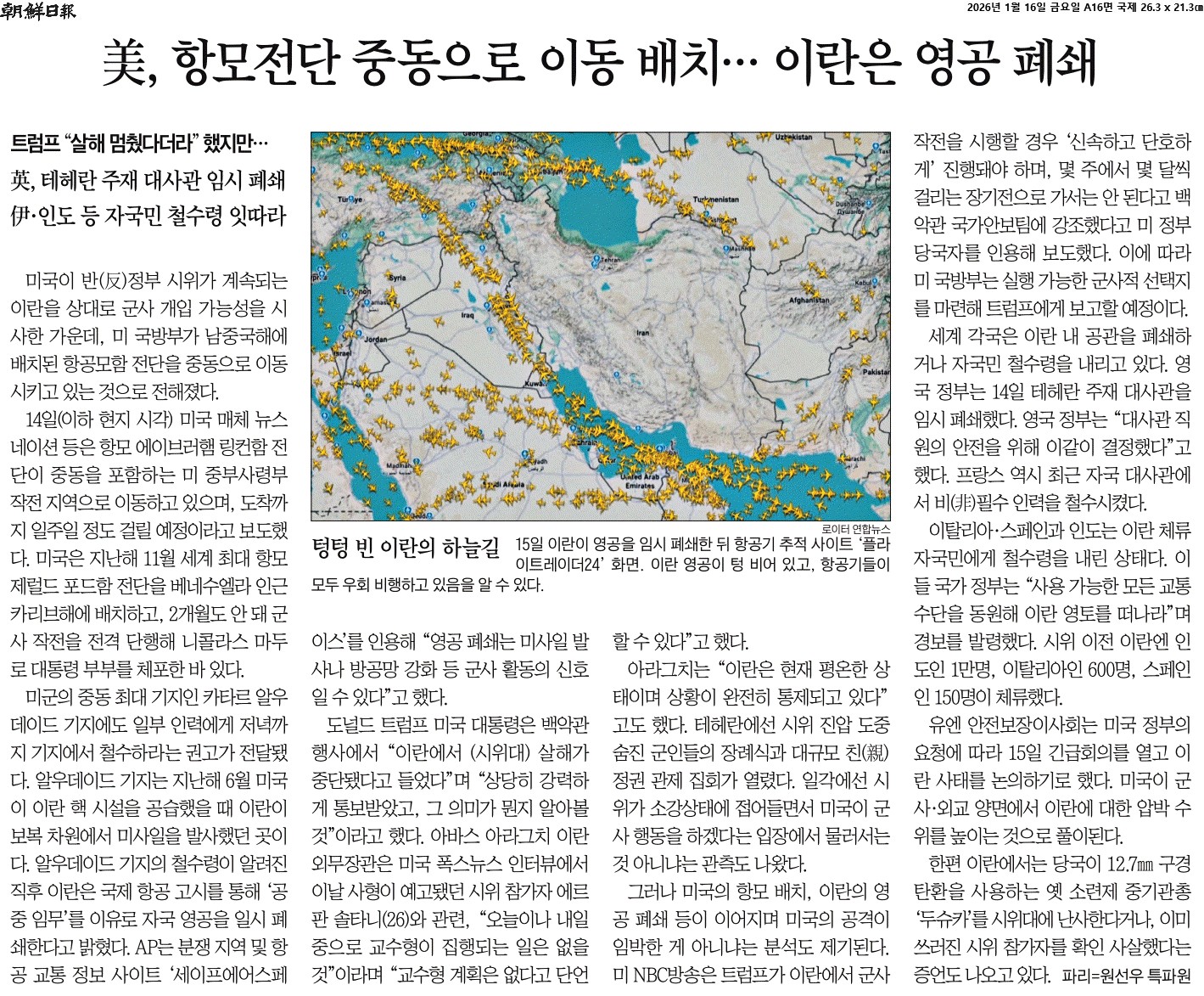 ② 14일(이하 현지 시각) 미국 매체 뉴스네이션 등은 항모 에이브러햄 링컨함 전단이 중동을 포함하는 미 중부사령부 작전 지역으로 이동하고 있으며, 도착까지 일주일 정도 걸릴 예정이라고 보도했다. 미국은 지난해 11월 세계 최대 항모 제럴드 포드함 전단을 베네수엘라 인근 카리브해에 배치하고, 2개월도 안 돼 군사 작전을 전격 단행해 니콜라스 마두로 대통령 부부를 체포한 바 있다.