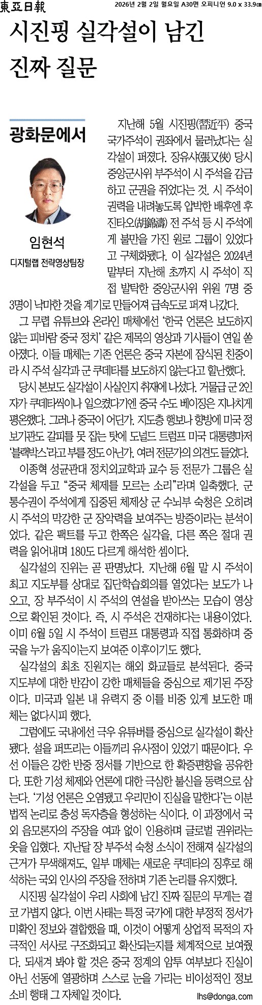 ⑤ 시진핑 실각설이 우리 사회에 남긴 진짜 질문의 무게는 결코 가볍지 않다. 이번 사태는 특정 국가에 대한 부정적 정서가 미확인 정보와 결합했을 때, 이것이 어떻게 상업적 목적의 자극적인 서사로 구조화되고 확산되는지를 체계적으로 보여줬다. 되새겨 봐야 할 것은 중국 정계의 암투 여부보다 진실이 아닌 선동에 열광하며 스스로 눈을 가리는 비이성적인 정보 소비 행태 그 자체일 것이다.